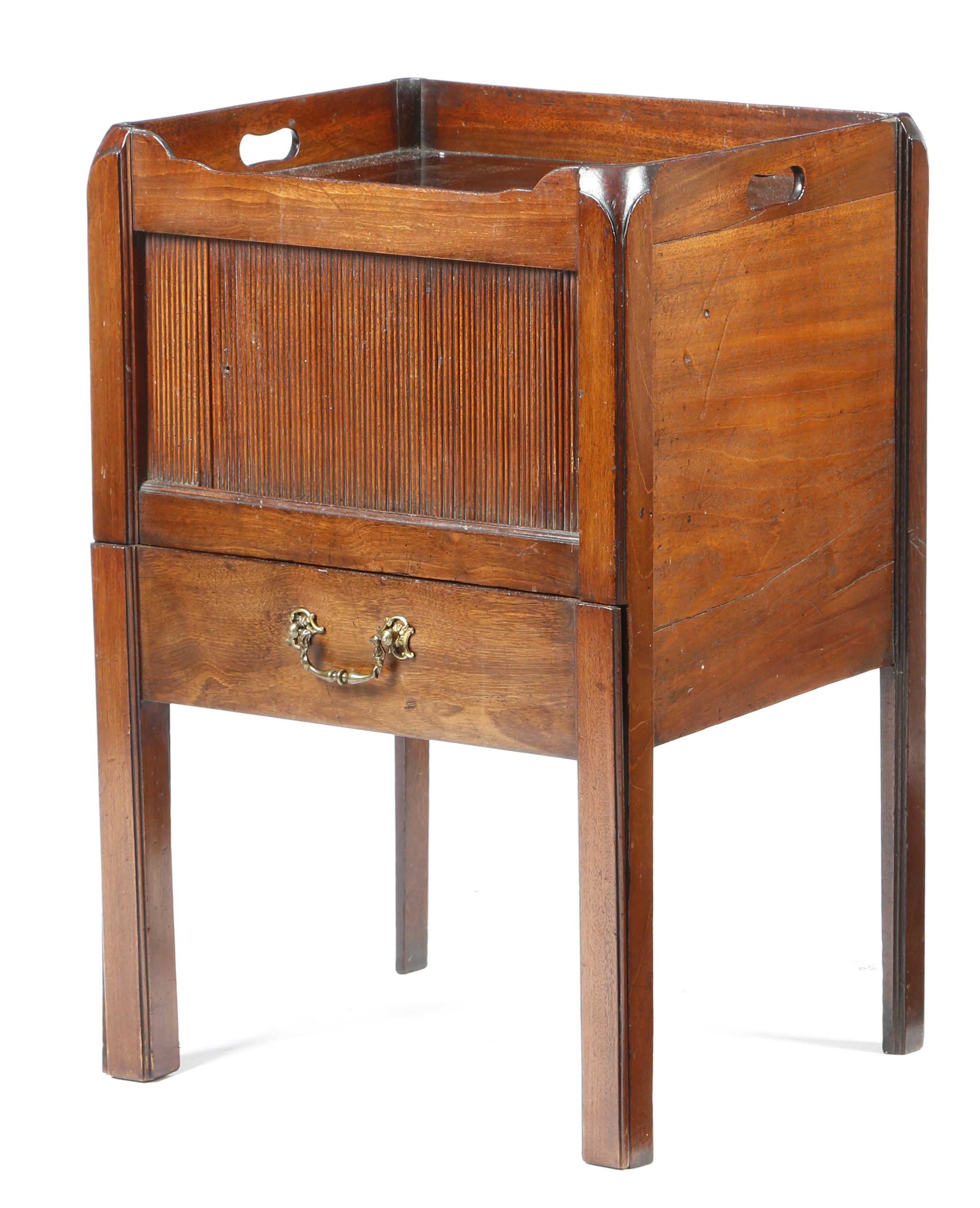 A George III mahogany tray-top bedside commode, the gallery top with pierced handgrips, above a tambour shutter and a pull-out base, 74.6cm high, 50.3cm wide, 42.7cm deep.