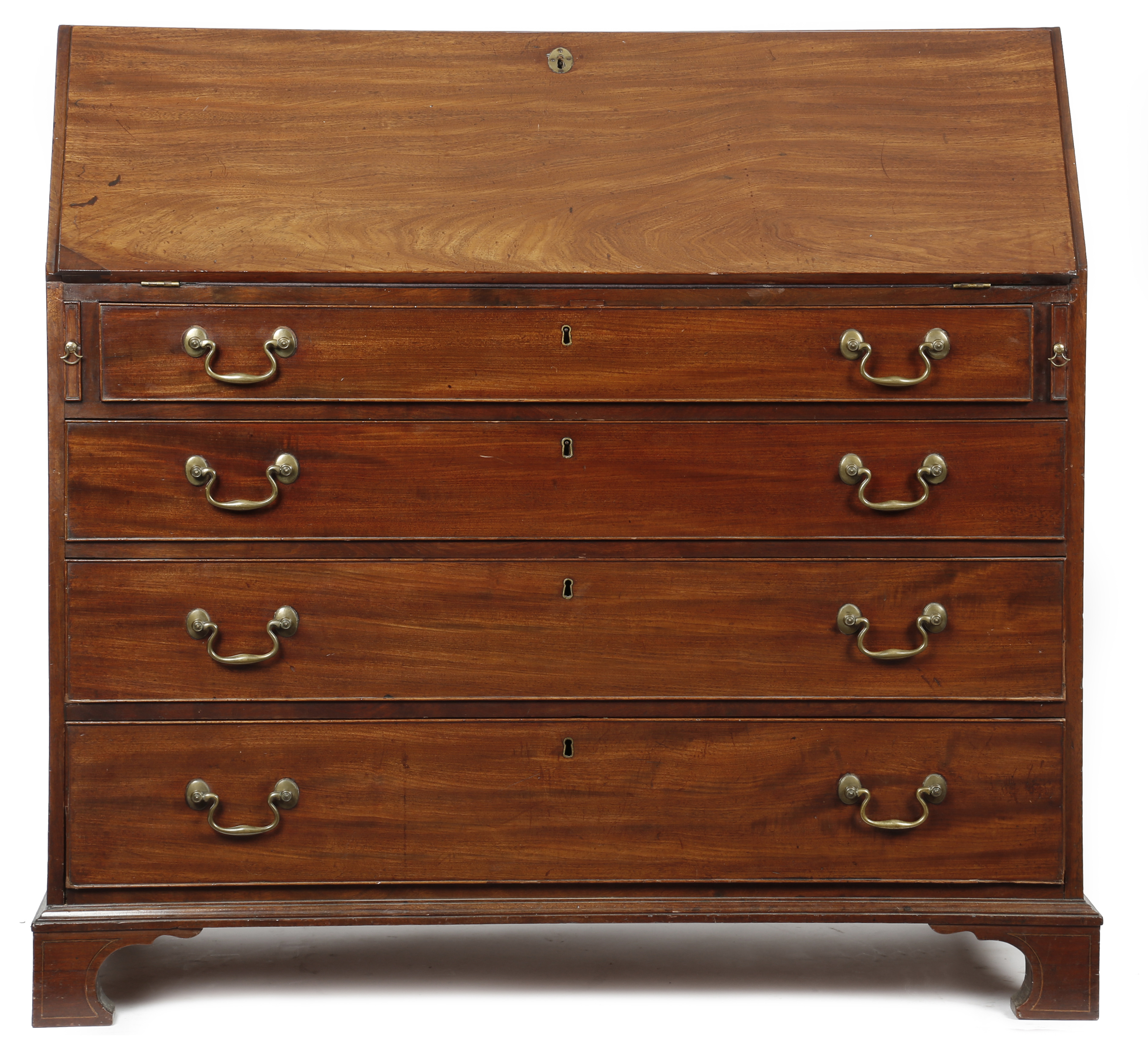 A George III mahogany bureau, the hinged fall revealing six satinwood fronted drawers, pigeonholes and a central cupboard, above four long graduated drawers and bracket feet inlaid with stringing, 108cm high, 115.8cm wide, 55.3cm deep.
