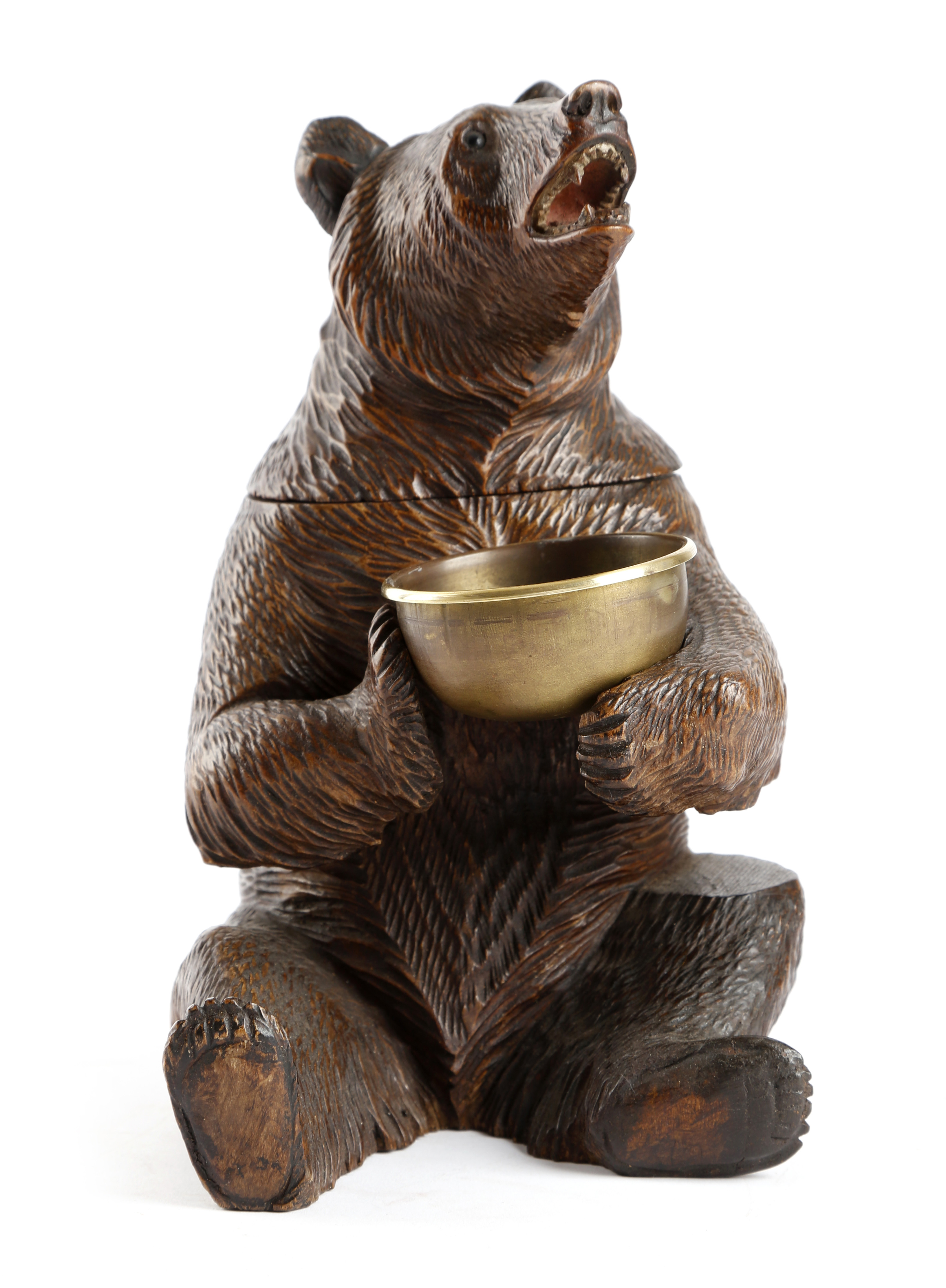 A Black Forest carved wood bear tobacco jar, with glass eyes, with a hinged lid and a brass bowl, late 19th / early 20th century, 23.3cm high.