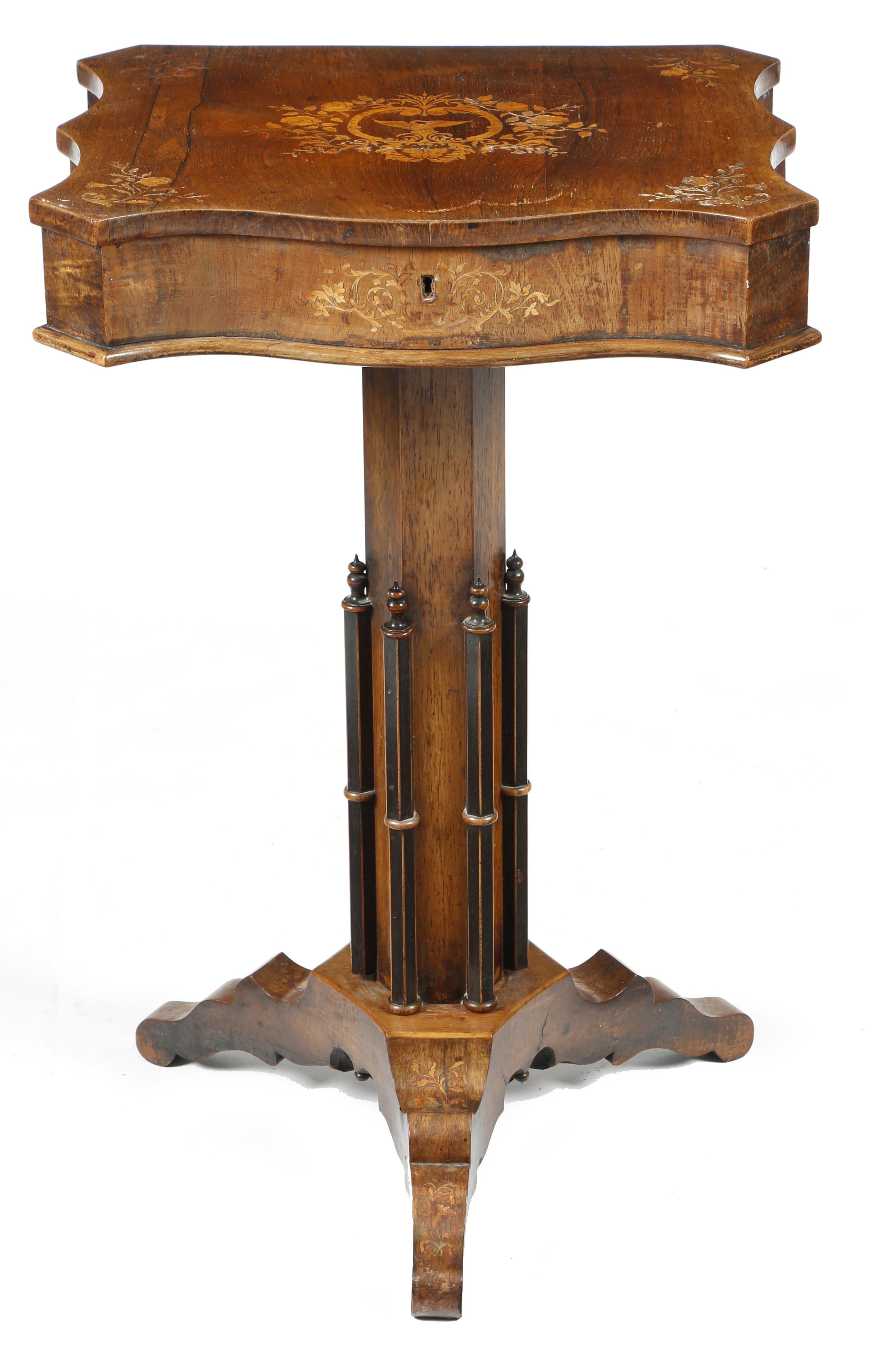 λ A 19th century continental rosewood and marquetry work table, the serpentine edge top inlaid with a swan, flowers, a butterfly and scrolling leaves, revealing a divided interior with ebonised lidded compartments, the faceted stem with applied columns on a triform base, 75.5cm high, 48.8cm wide, 41cm deep.