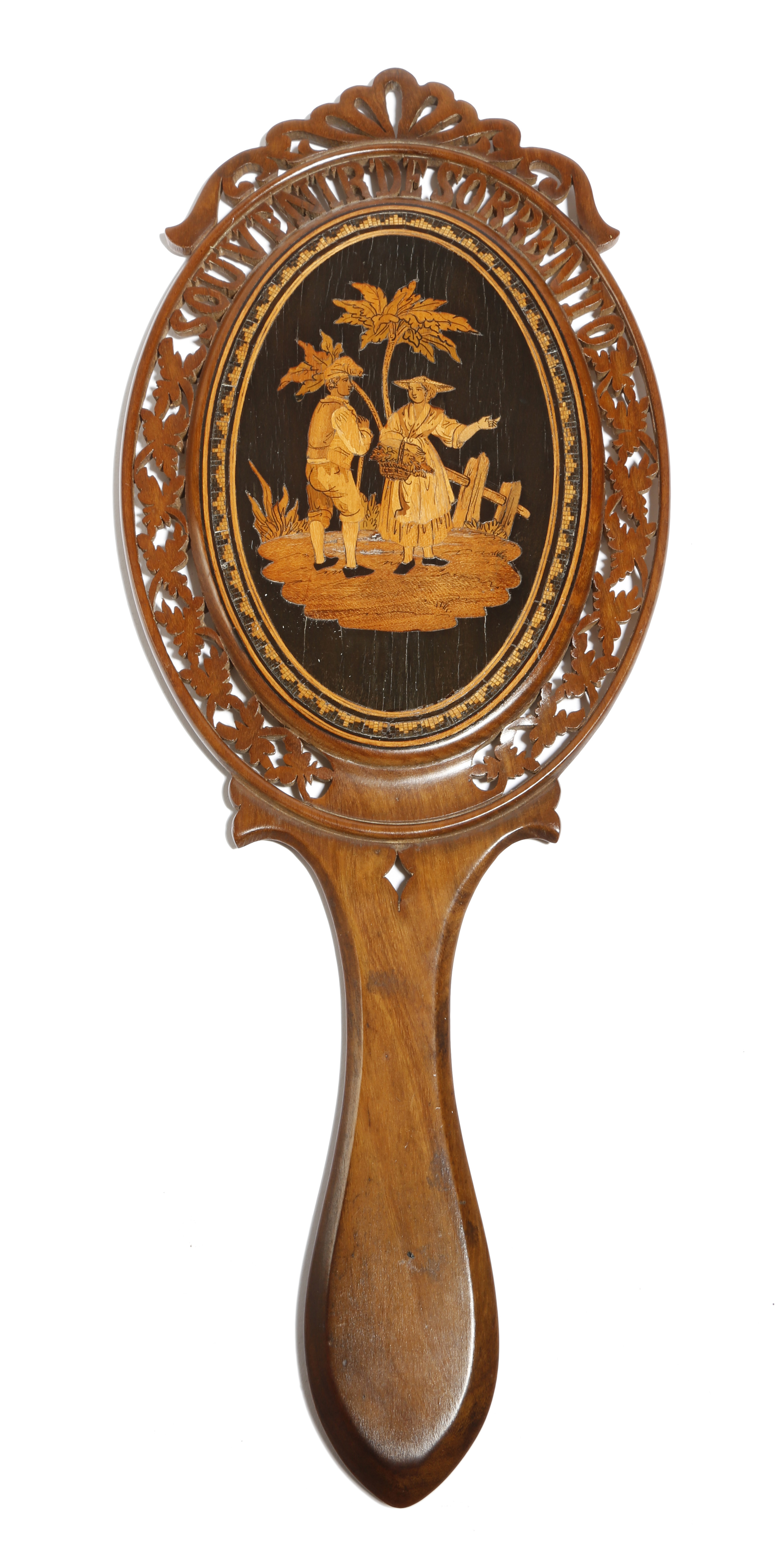 A late 19th century Italian Sorrento olivewood and marquetry hand mirror, the oval plate within a pierced fret border, with leaves and 'SOUVENIR DE SORRENTO', the back inlaid with a man and a woman, 34.6cm long.