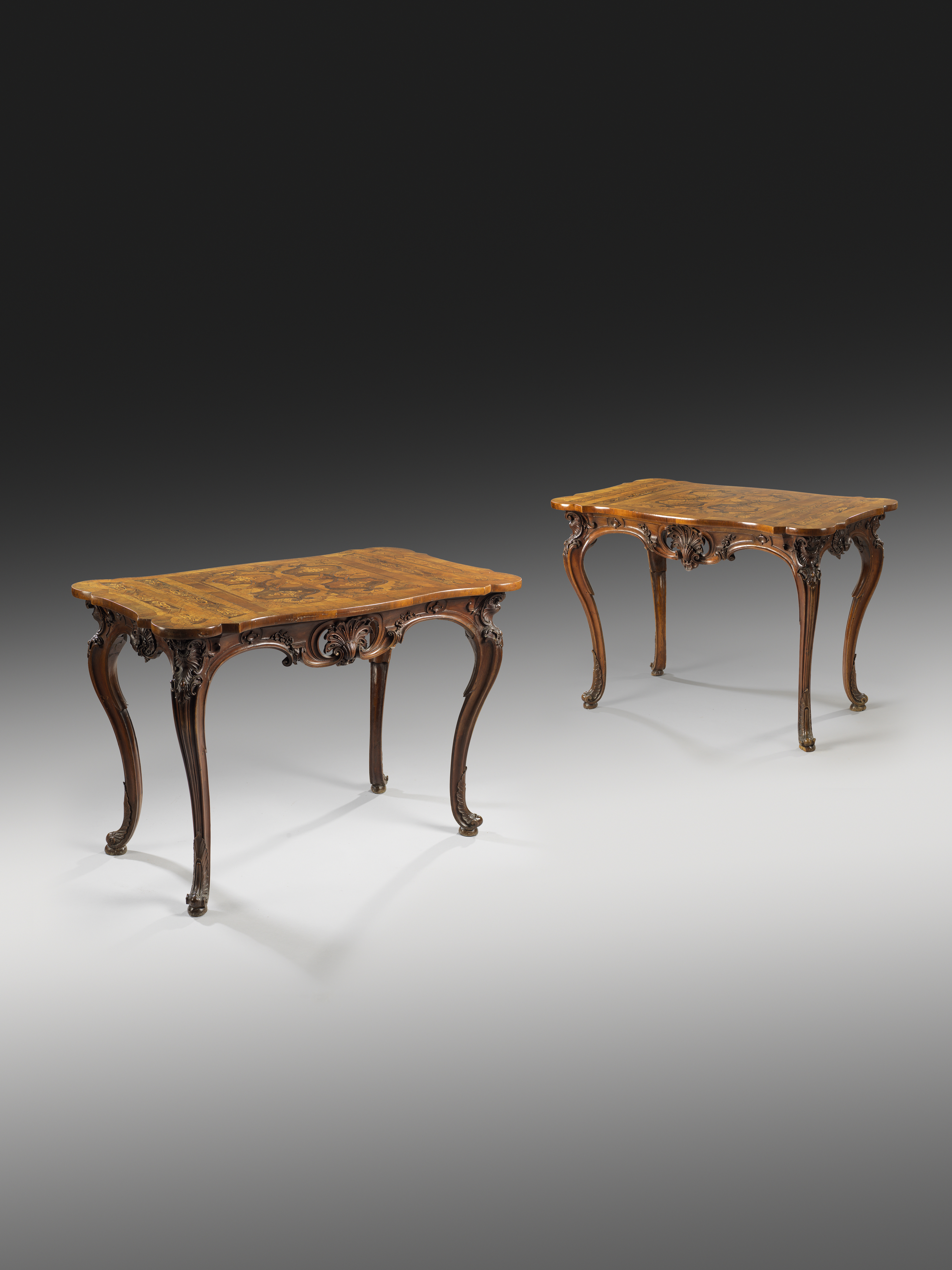 A pair of mid-18th century Italian Venetian walnut Rococo centre tables, each with a serpentine top cross-banded and inlaid with marquetry leaves, flowers and strap-work, above a scroll carved frieze centred with a pierced and fluted shell-shape cartouche, finely carved with leaves, with conforming cabriole legs, on leaf carved scroll feet and pad toes, slight differences to carving, 77cm high, 108cm wide, 65.4cm deep. (2)