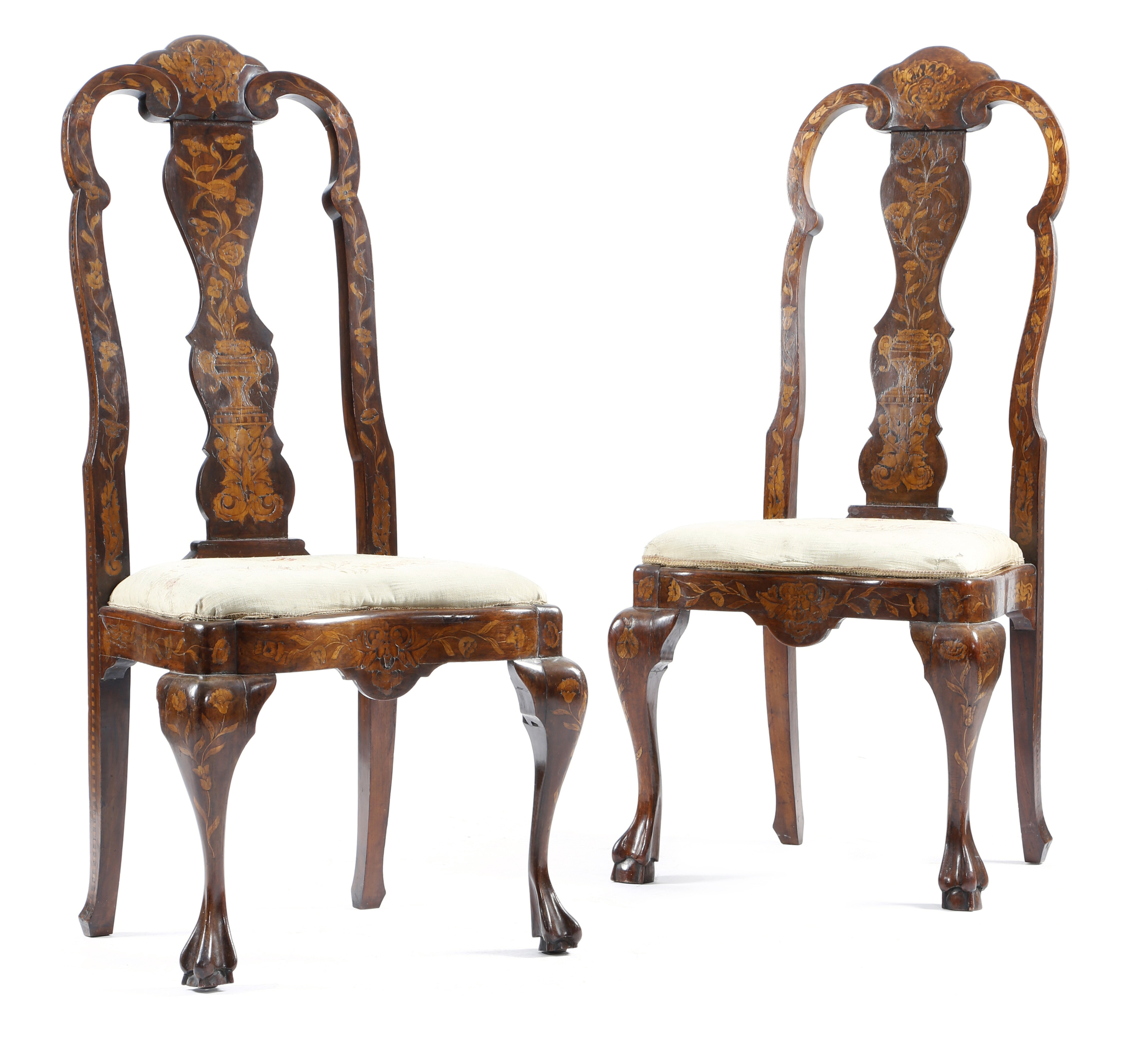 A near pair of Dutch walnut and marquetry side chairs, inlaid with cherubs, an urn of flowers and scrolling foliage, with a shaped splat above a needlework drop-in seat, on cabriole front legs and stylised claw and ball feet, 19th century. (2)