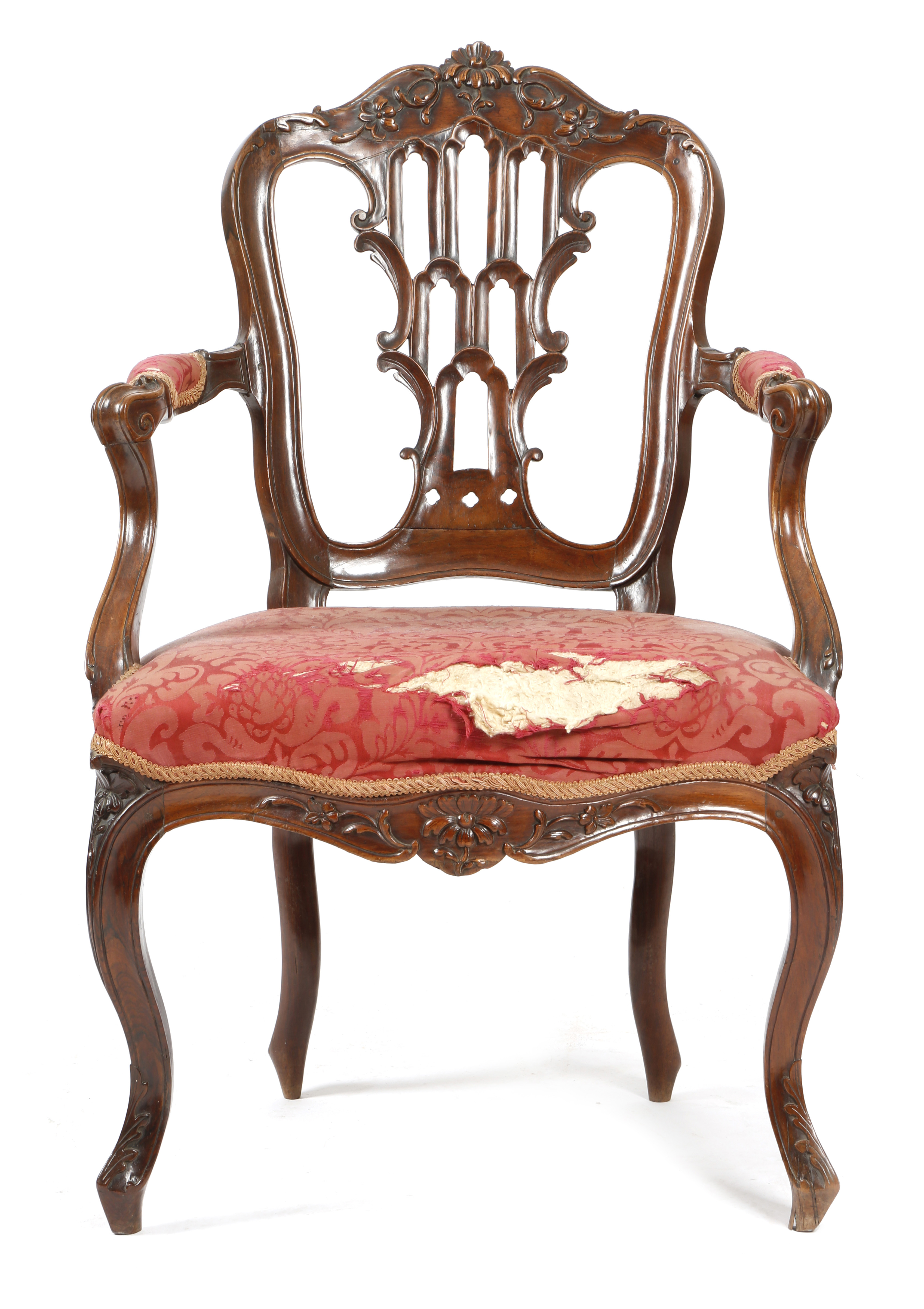 λ An 18th century rosewood fauteuil in Louis XV style, the serpentine top rail carved with flowers and scrolling foliage, above a scroll and arcaded pierced splat back and a stuffed-over seat on flower and leaf carved cabriole legs, possibly Portuguese.