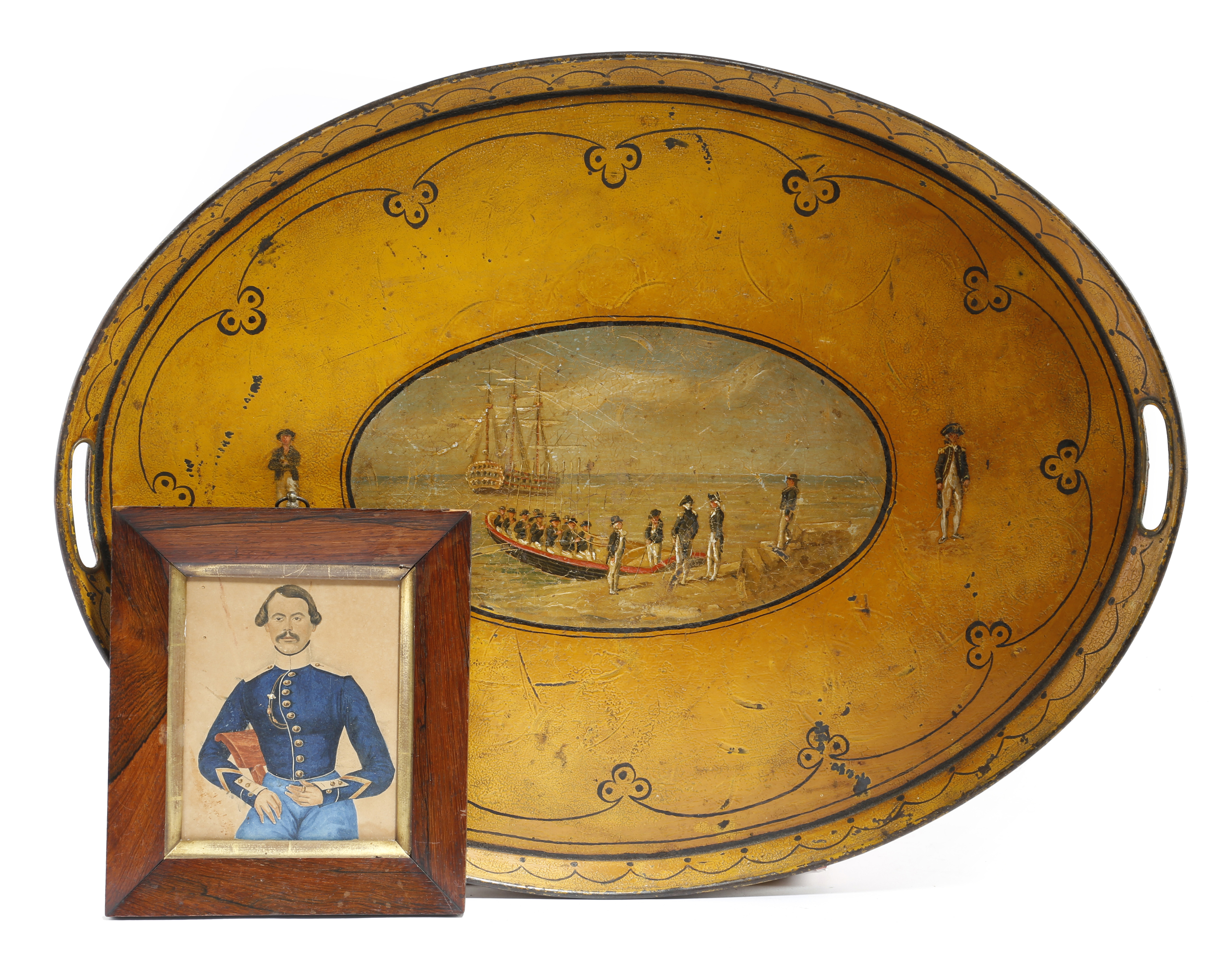 Naval interest. A 19th century painted tole oval tray, the gallery with a pair of pierced handgrips and painted with a central scene of sailors coming ashore from a sailing ship, 59cm wide, together with a watercolour portrait of a 19th century soldier. (2)