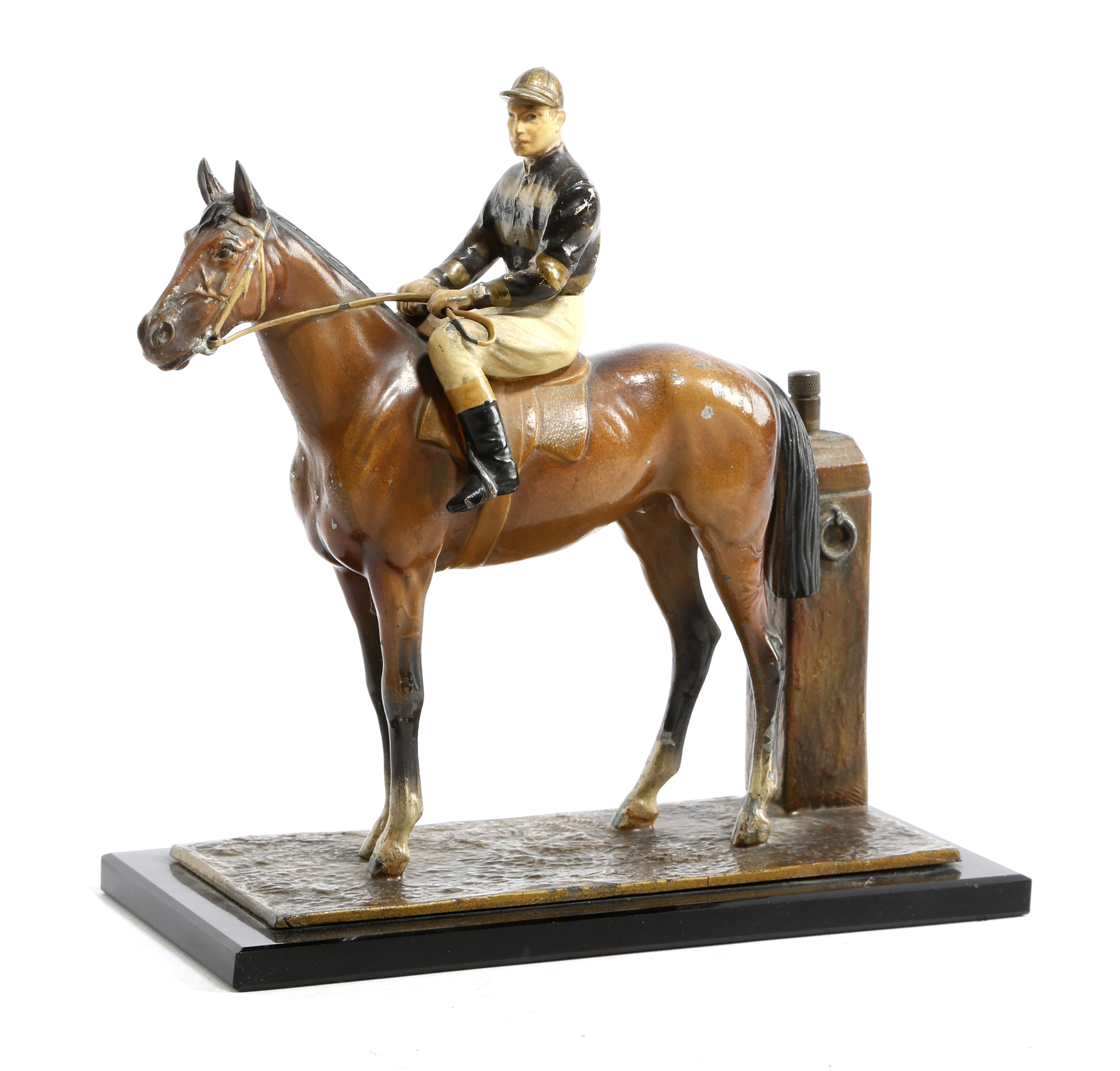 An early 20th century cold painted spelter table lighter, modelled as a racehorse and jockey, on a black glass base, 17.4cm high.