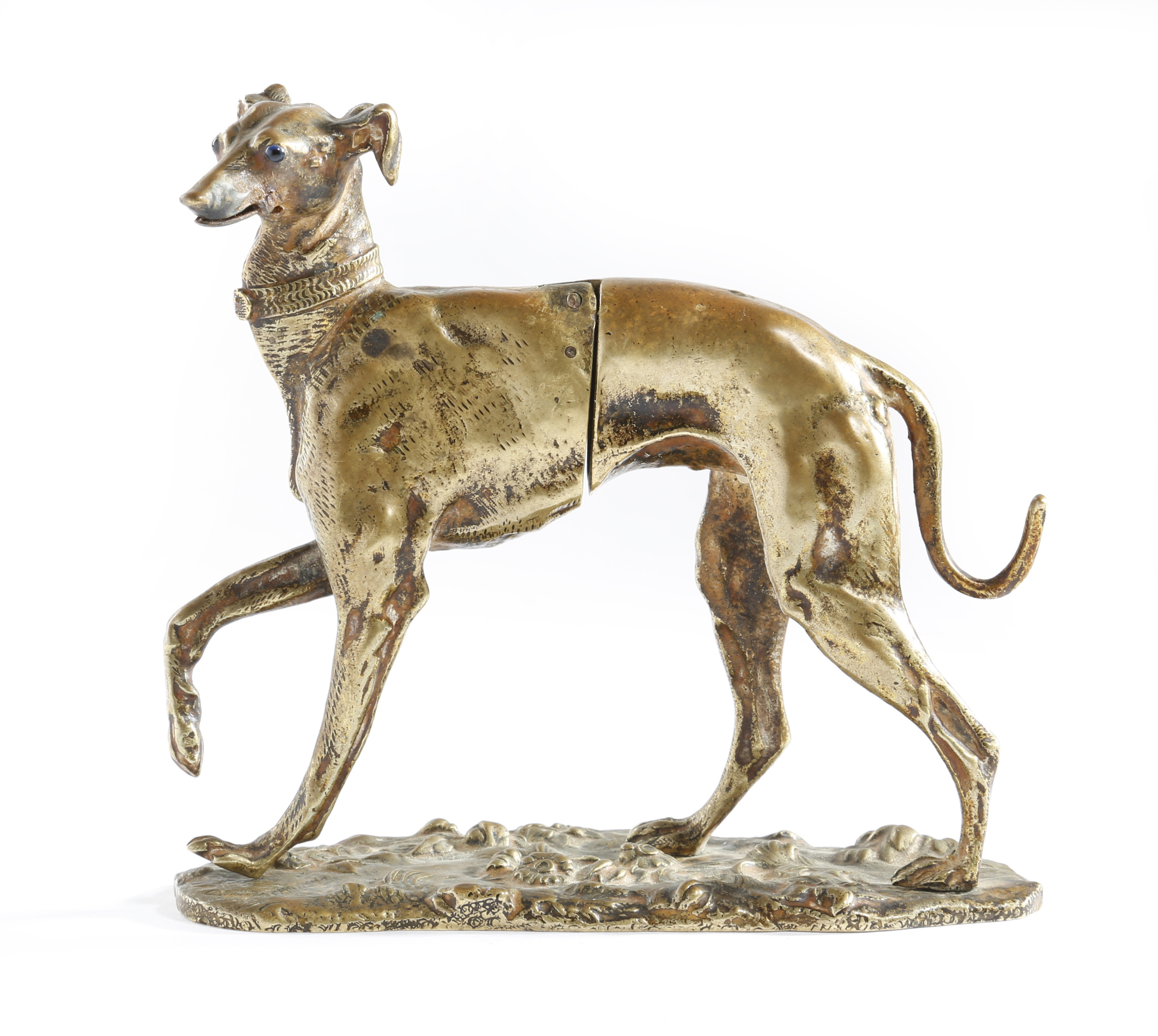 A French bronze greyhound desk card holder / paperclip, with glass eyes, a hinged and sprung body and with an articulated mouth, the naturalistic base indistinctly signed '... GIROUX', stamped to the underside '17-659', 12.4cm high, 13cm long.