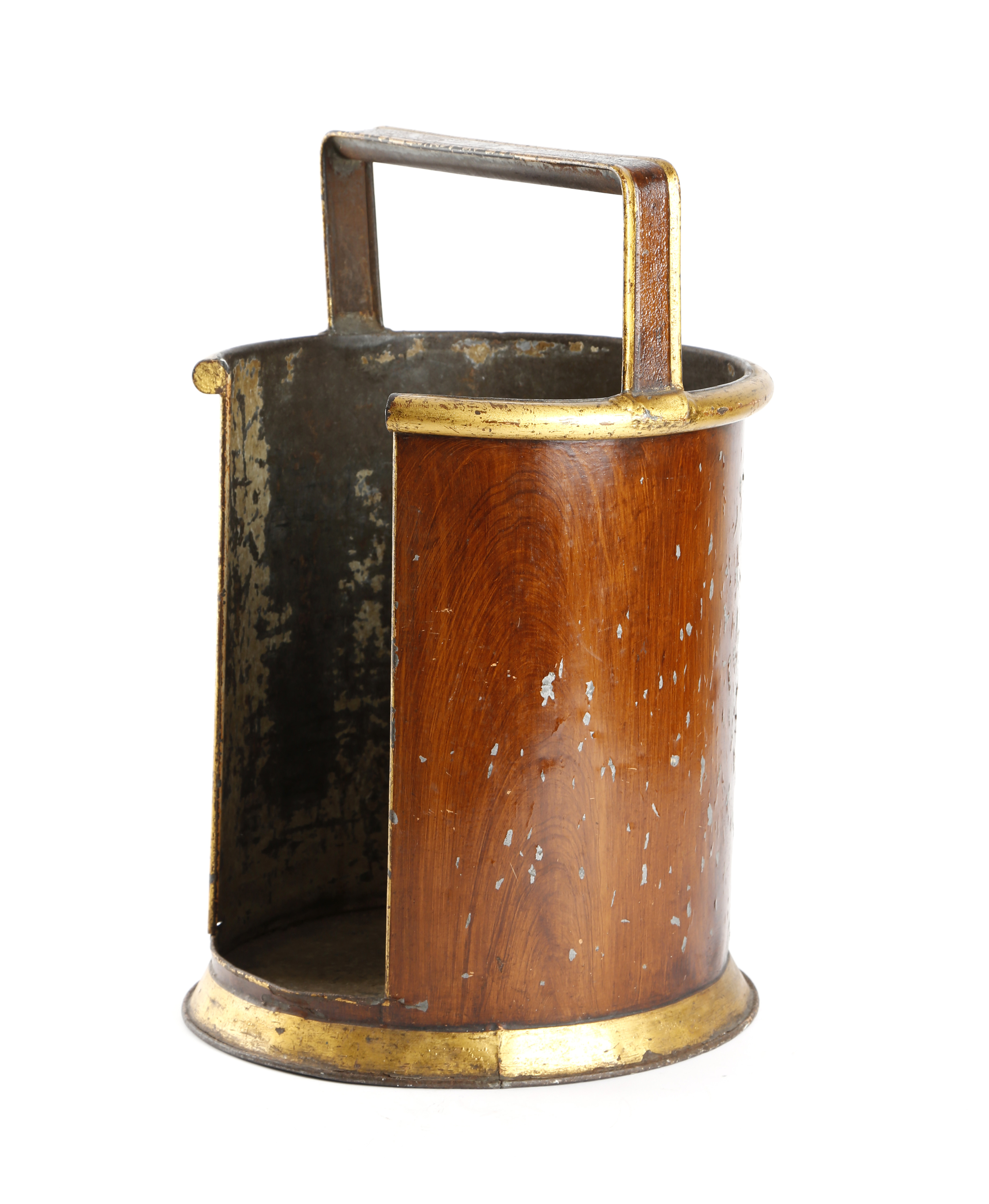 A Victorian tole peinte plate bucket, with parcel gilt and simulated wood decoration, 50cm high, 33.2cm diameter.