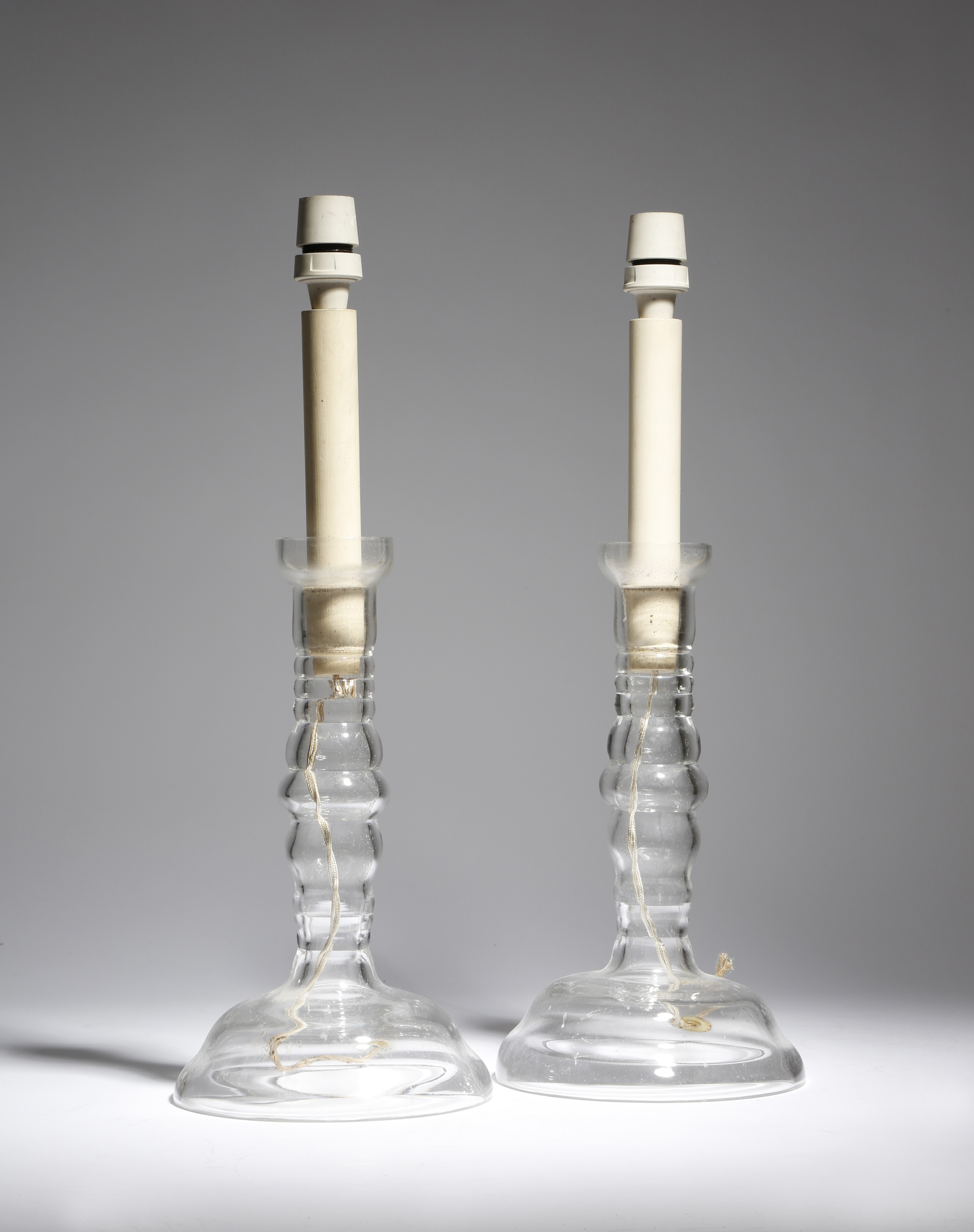 A pair of glass table lamps by Colefax and Fowler, each with a ribbed stem and a domed foot, c.1960s, 31.3cm high (excluding fittings). (2)