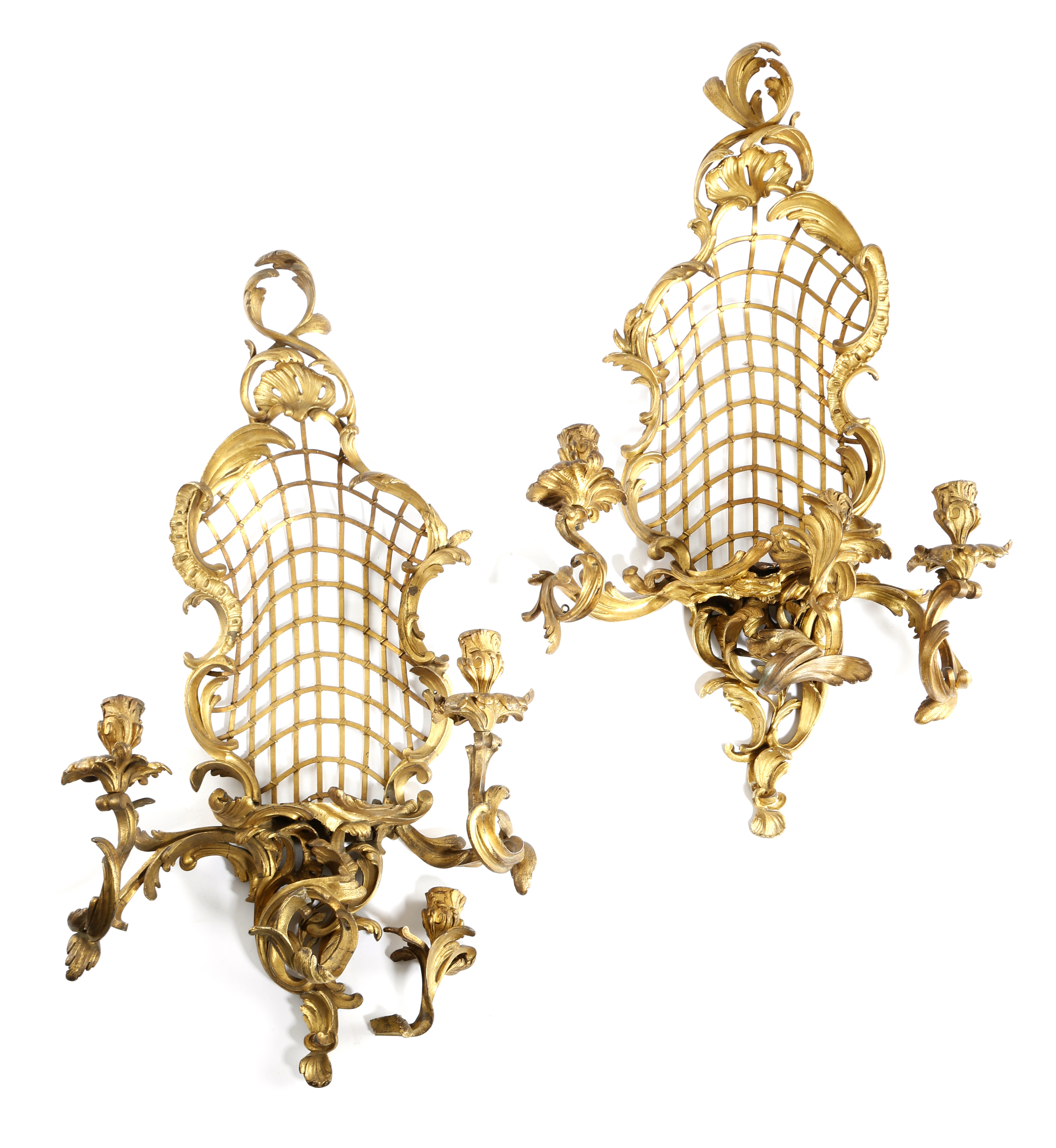 A pair of French ormolu three-light wall appliques in Louis XV style, each with a leaf, scroll and rocaille frame with a lattice back above a shelf for a porcelain figure, above three scroll branches with naturalistic nozzles, (one arm broken), stamped '18697', 67cm high, 37cm wide. (2)