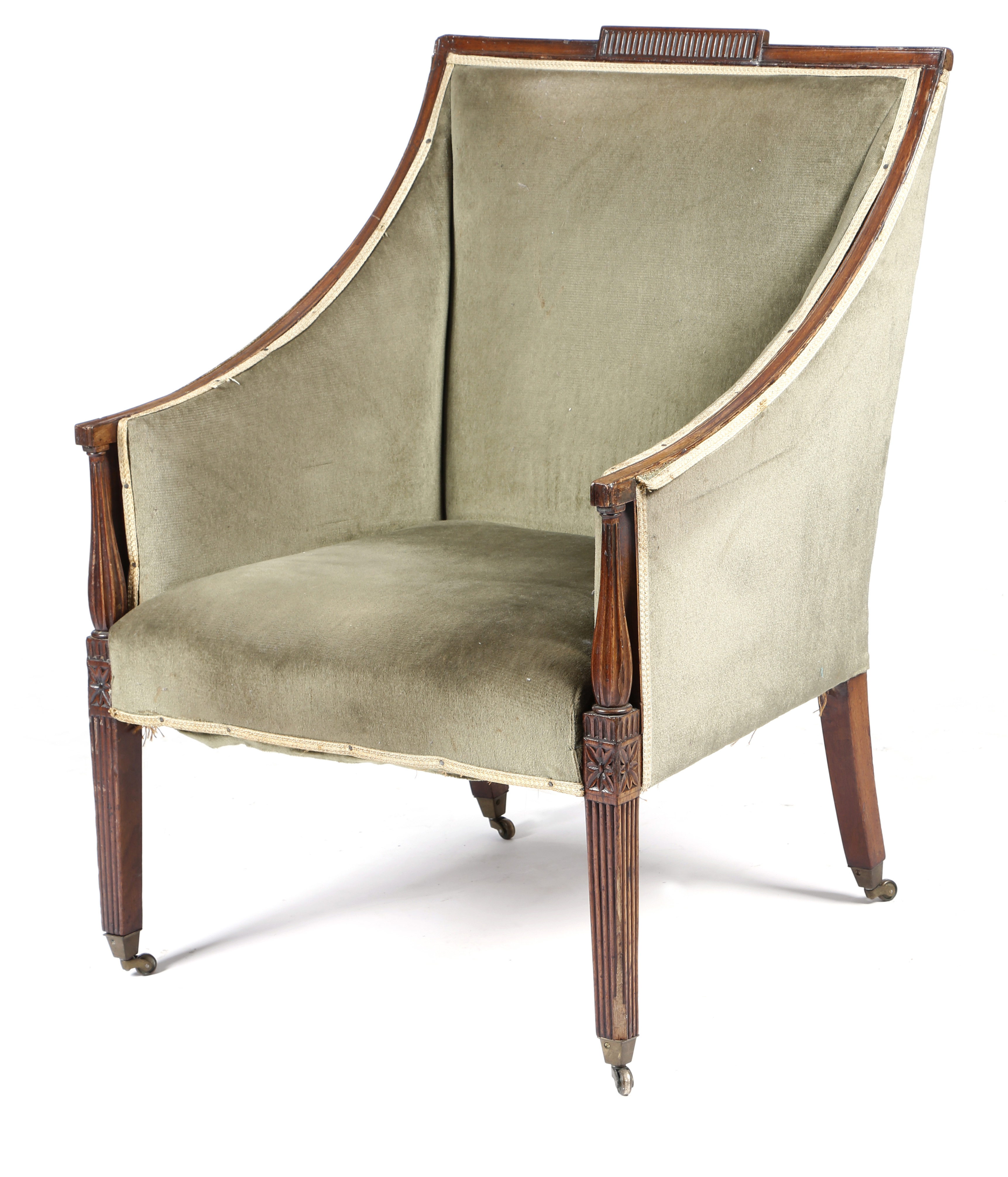 A George III mahogany bergere armchair, upholstered with green plush fabric, the moulded frame with fluted baluster arm supports and reeded square tapering front legs and brass castors.