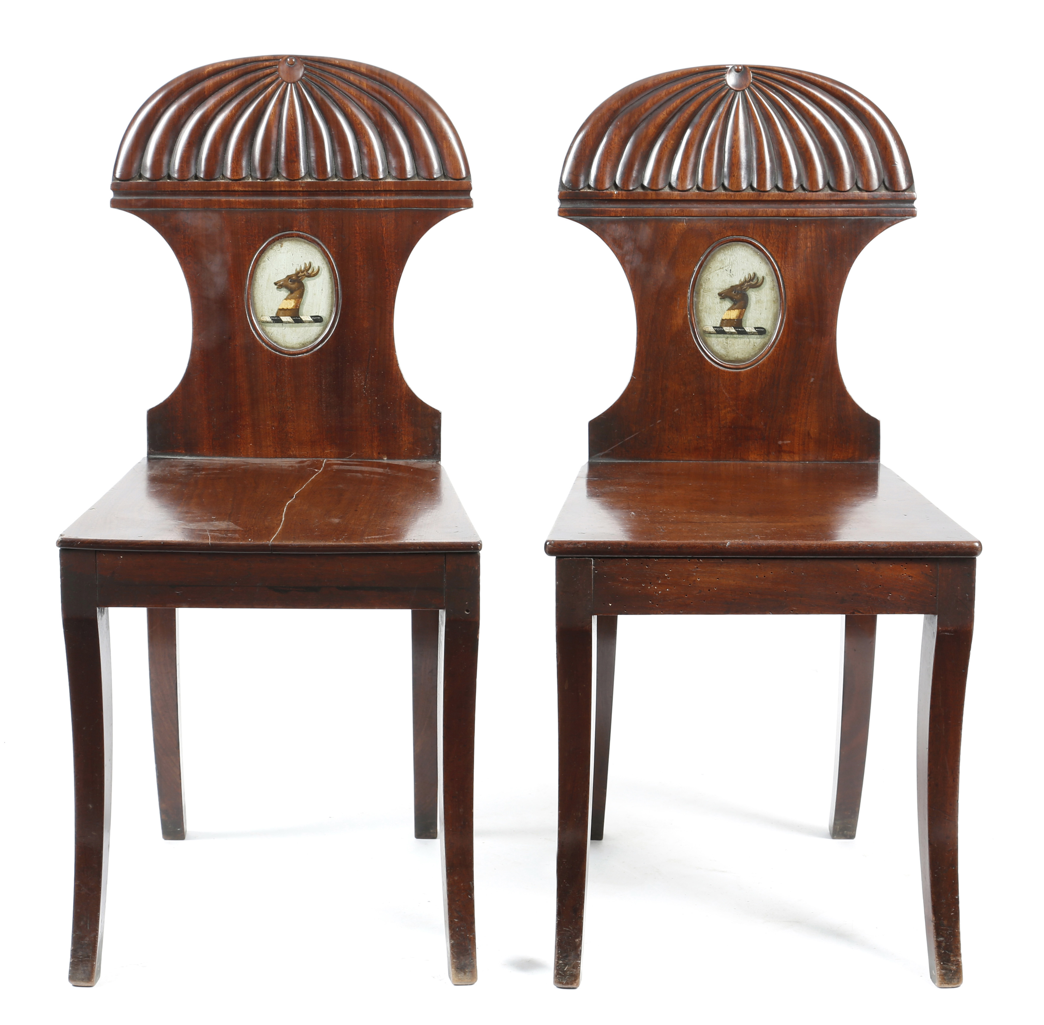 A pair of Regency mahogany hall chairs, each with a ribbed waisted back centred with an oval panel painted with an elk's head crest for the Campbell-Orde family, on sabre legs. (2)
