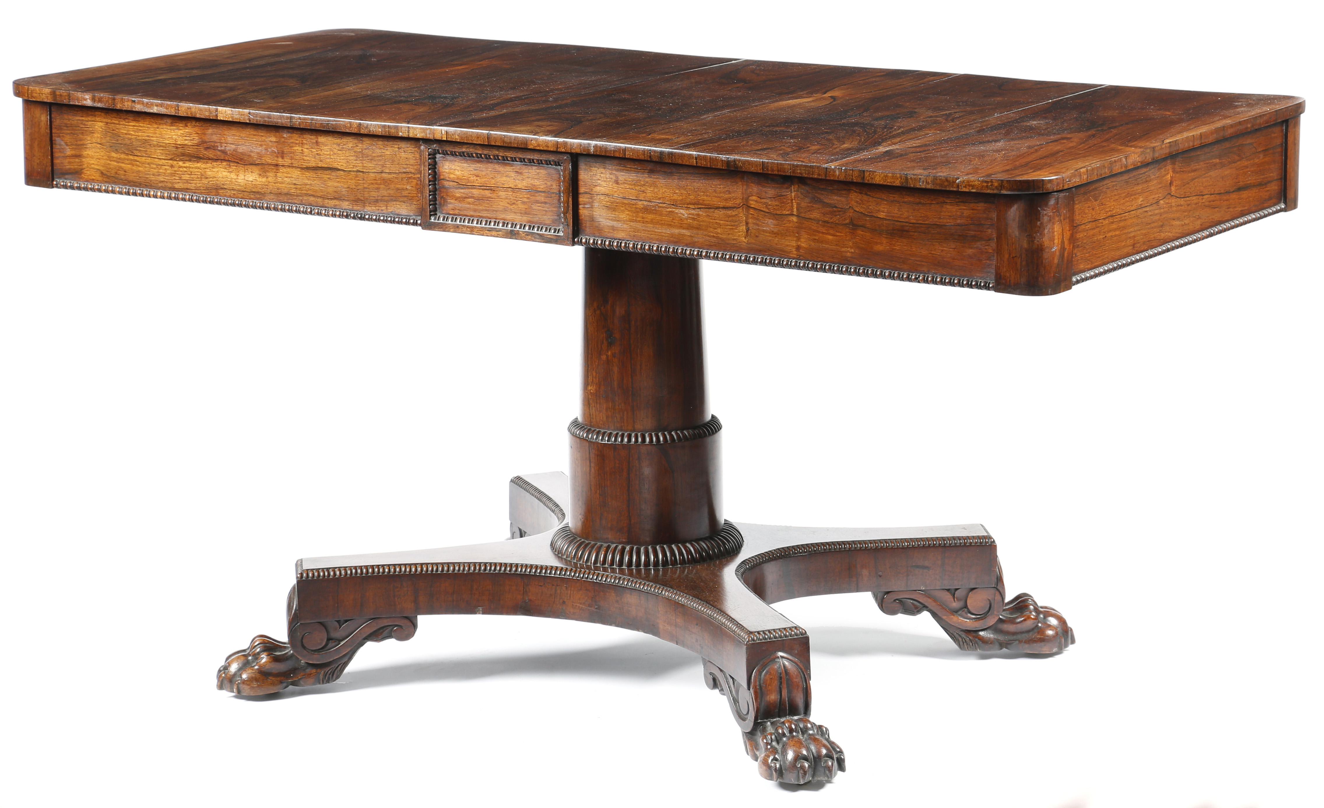 λ A William IV rosewood library table, with nulled decoration, the rectangular top with rounded corners, above two frieze drawers, on a quatreform base and carved lion's paw feet, on sunken brass castors, 76.4cm high, 149.3cm wide, 71cm deep.