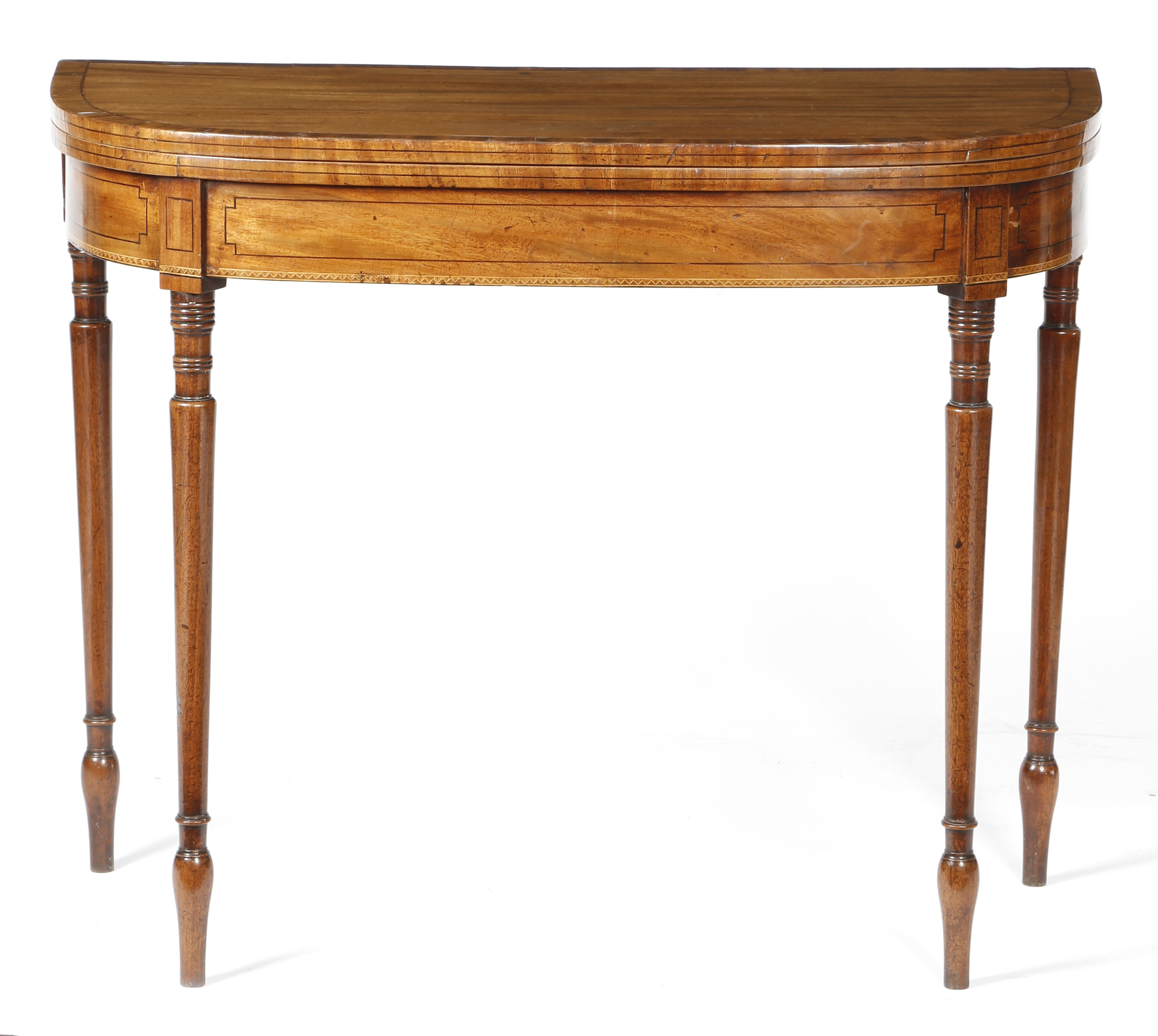 A Regency mahogany card table, inlaid with ebonised stringing and a dogtooth band, the crossbanded 'D' shaped hinged top on twin gate supports and ring turned tapering legs, 73cm high, 90.2cm wide, 44cm deep.