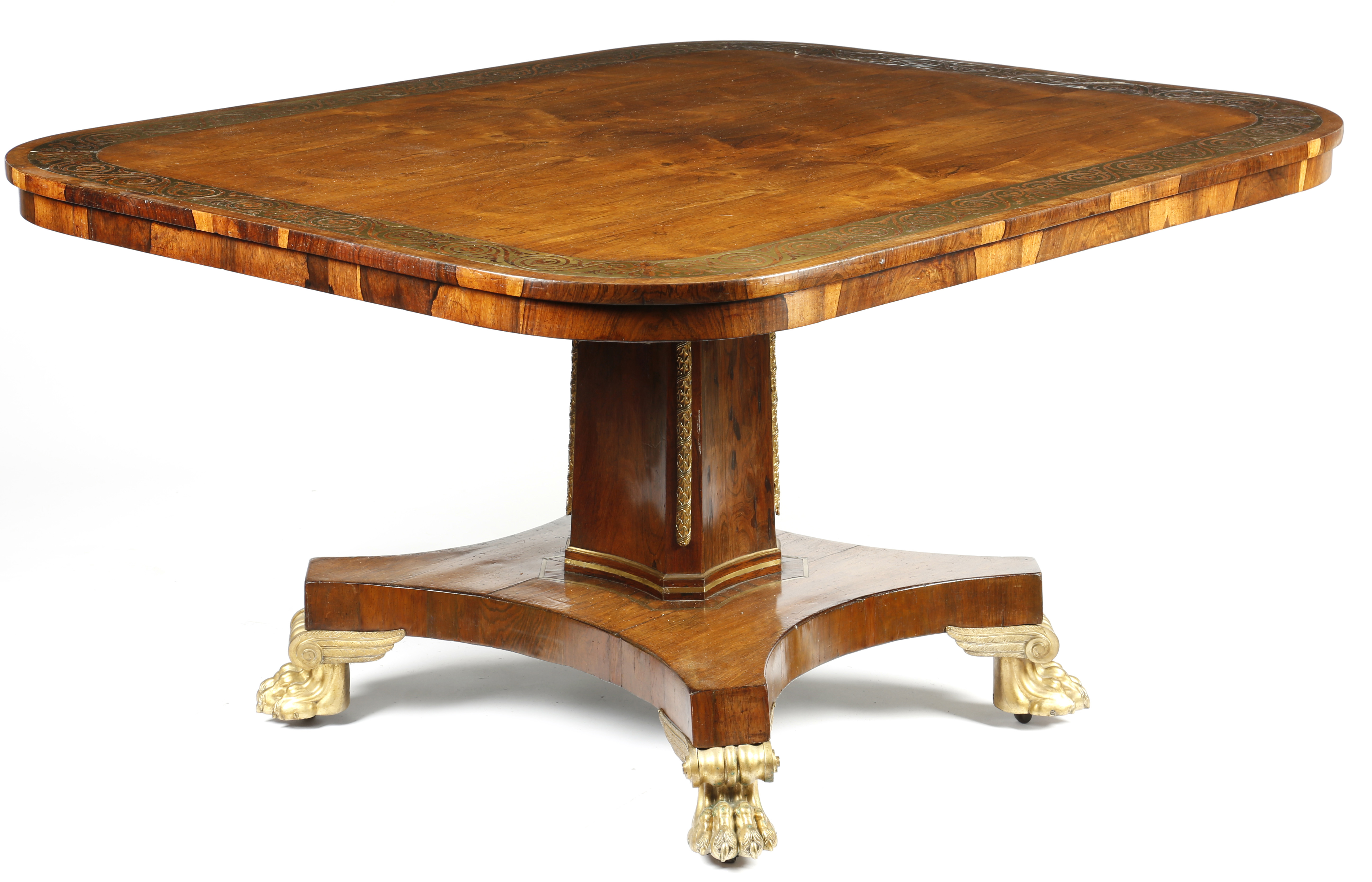 λ A Regency rosewood and brass mounted centre table, the tilt-top inlaid with a band of marquetry decorated with scrolling leaves and palmettes, on a concave stem applied with bands of laurel leaves, with a platform base and gilt bronze scrolled and winged lion's paw feet and castors, 77.8cm high, 116 x 148cm.