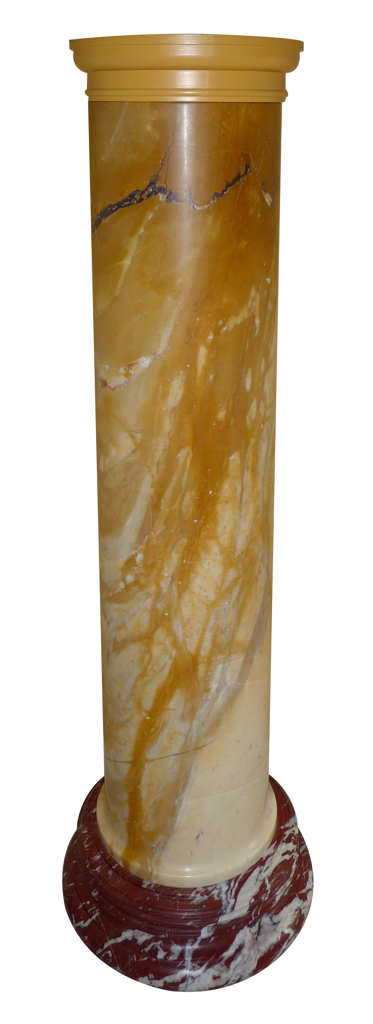 A pair of Siena marble columns, each with a later painted wood top, on a red marble plinth base, 142cm high. (2)