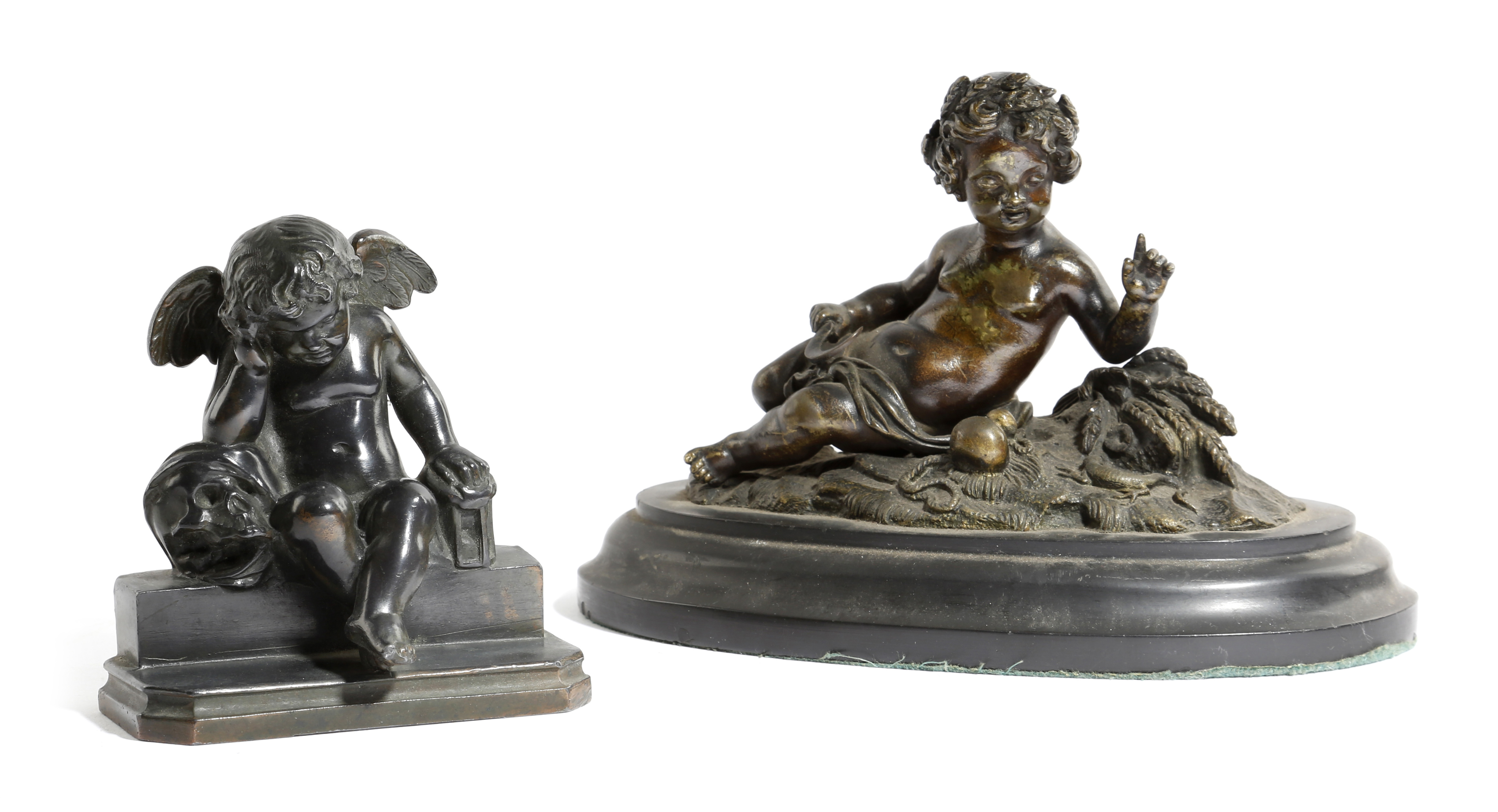 A 19th century French bronze figure of a cherub, lying on a naturalistic mound with sheaves of wheat, holding a scyth and with a lizard and a gourd, on a stepped slate base, together with a bronze figure of Cupid, seated, leaning on a skull, marked 'VM 164', 19.2cm wide (max). (2)