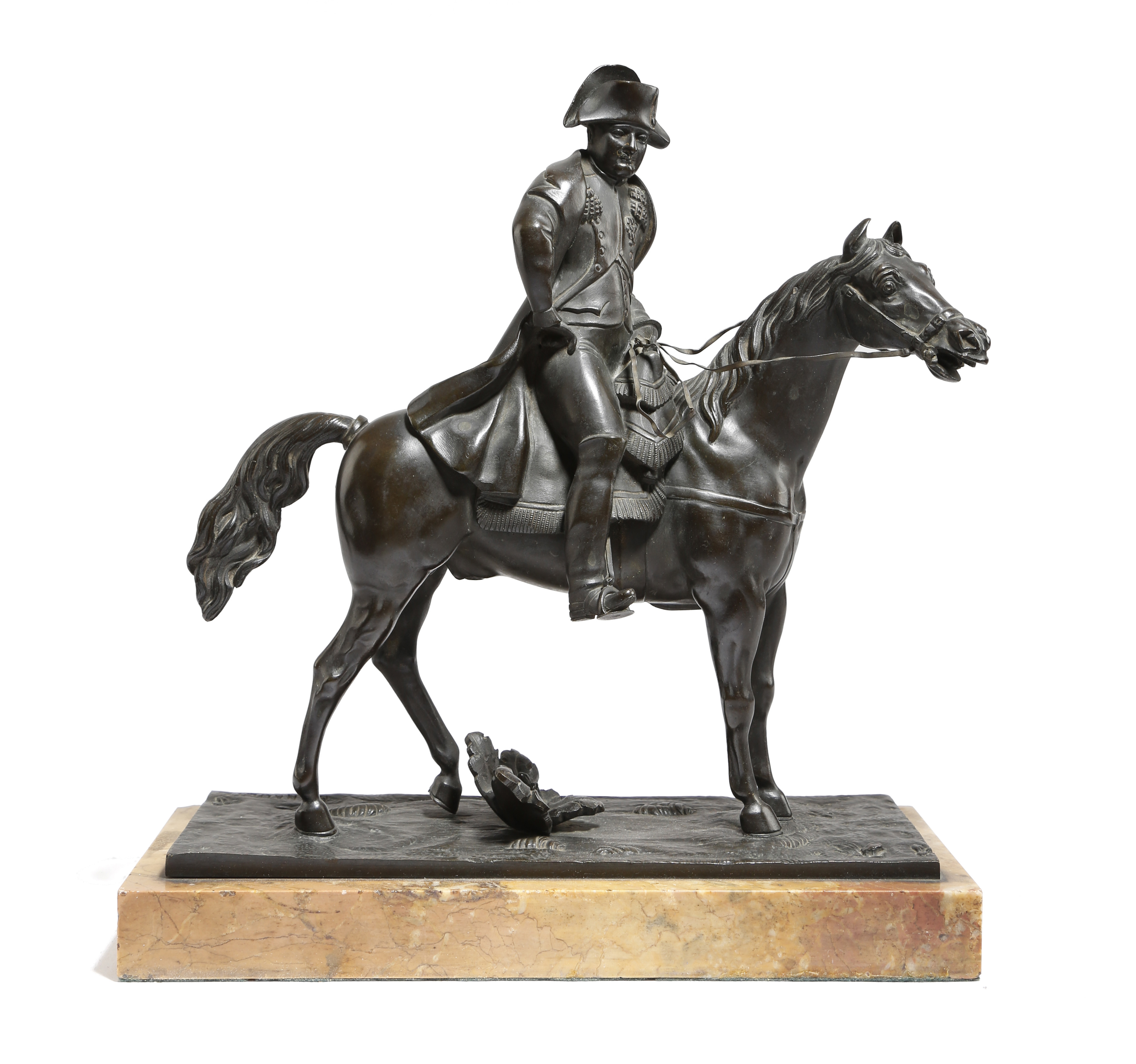 A 19th century French bronze equestrian group of Napoleon Bonaparte on horseback, the naturalistic base signed 'RENAULT', on a Siena marble plinth, 30.5cm high, 28.2cm wide.