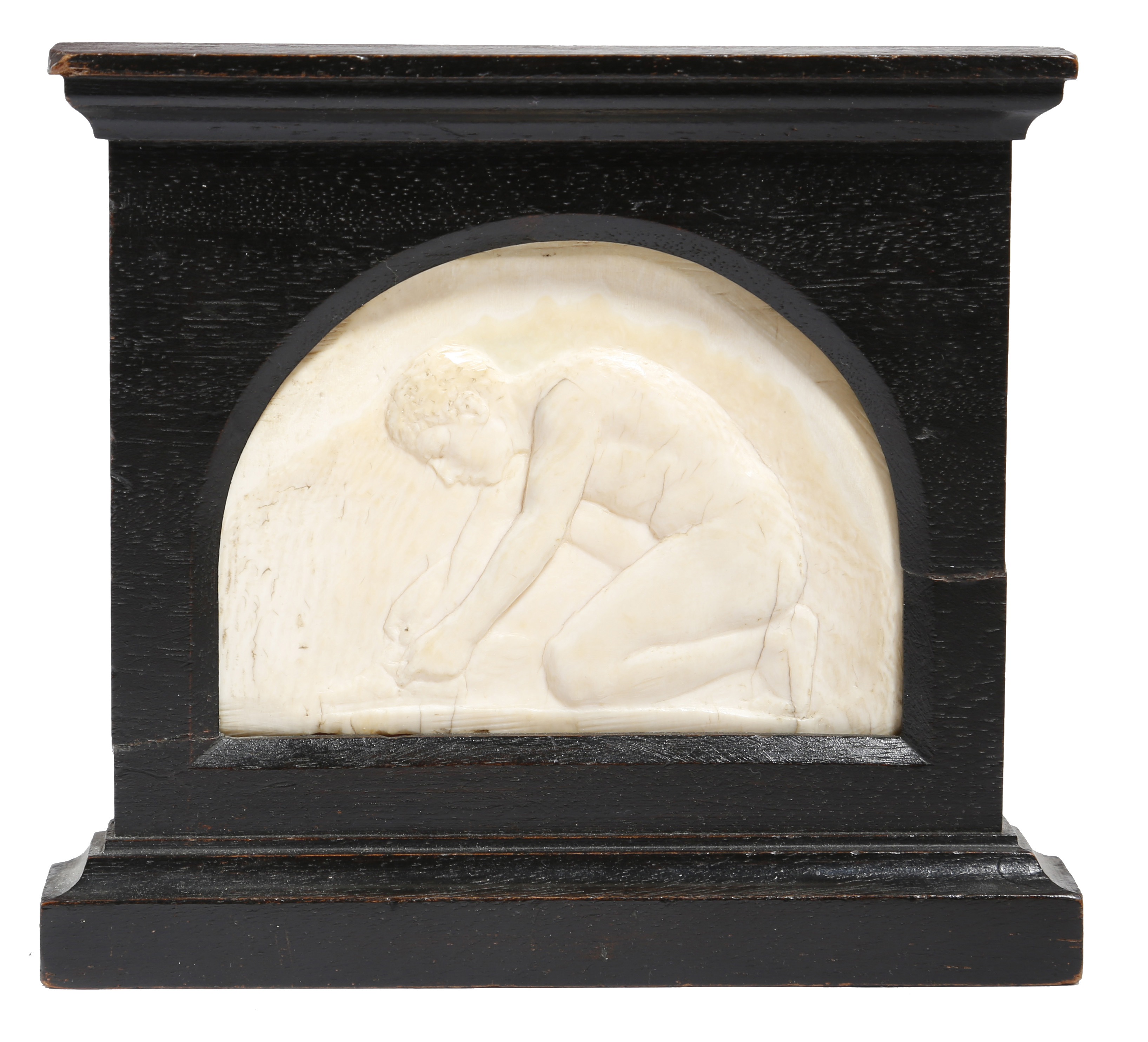 λ An Art Deco carved ivory relief plaque of Mercury, in an ebonised frame, 13 x 14.4cm.
