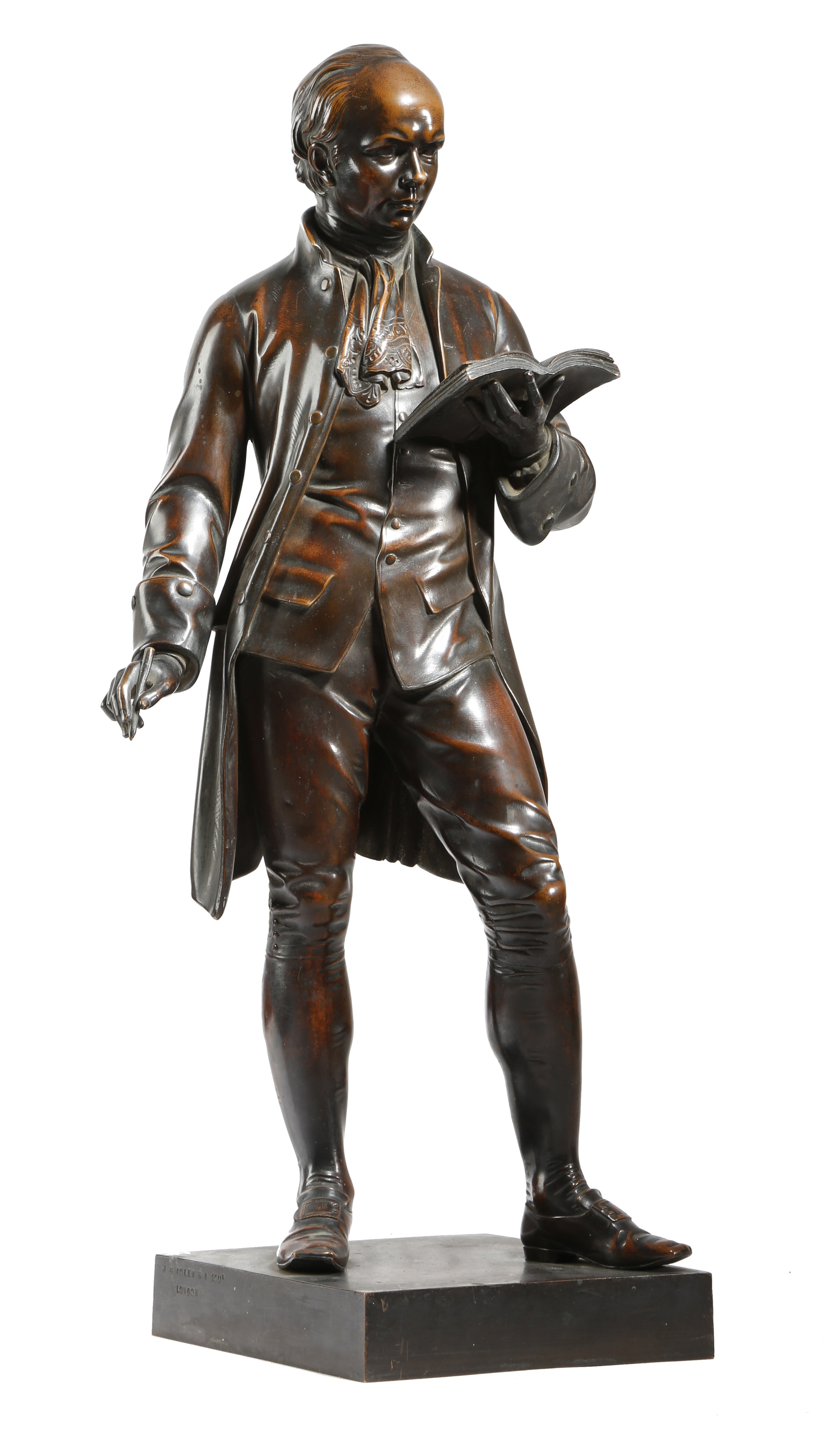 John Henry Foley R. A. (Irish 1818-1874). A 19th century bronzed electrotype figure of Oliver Goldsmith, the writer standing holding a book in his left hand and a pen in his right, the square base with impressed marks 'J H FOLEY RA SCUL LONDON' and 'ELKINGTON CO FOUNDERS', 50.5cm high.