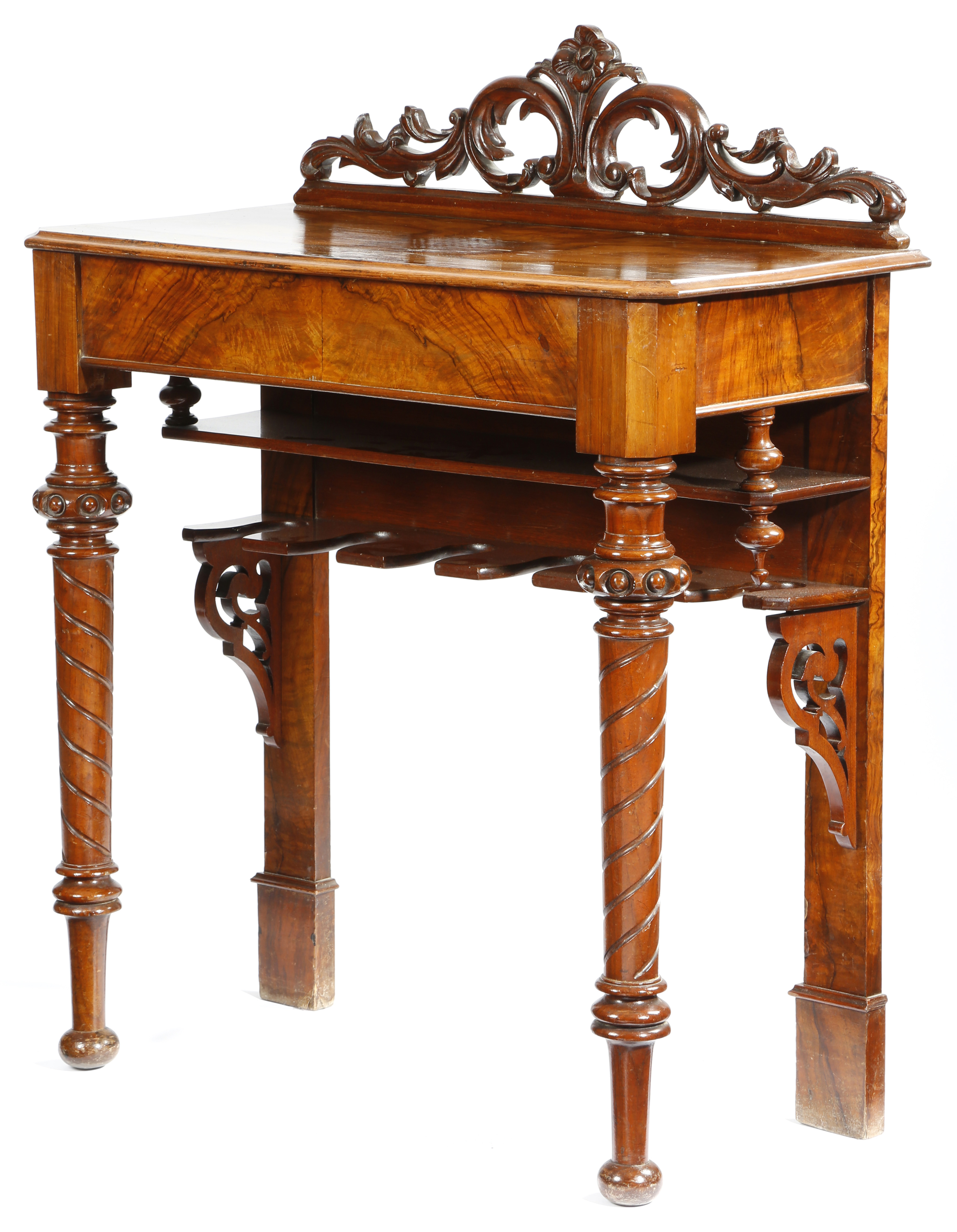 An unusual Victorian walnut whip and boot hall table, with a leaf and flower carved top rail above a shelf and with divisions for six boots, 100.8cm high, 80.8cm wide, 39.5cm deep.