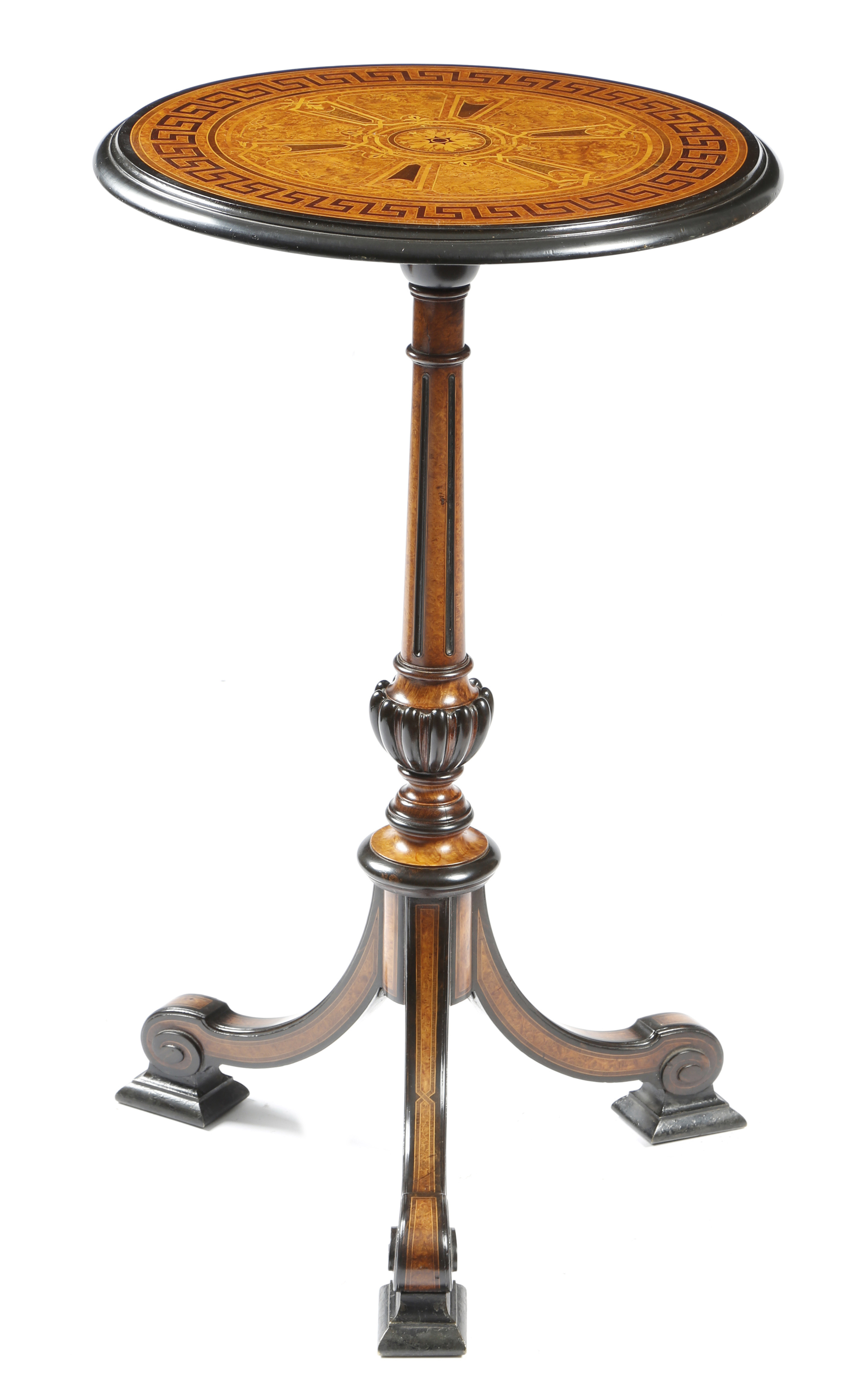 A Victorian amboyna and ebony tripod table in the manner of Holland and Sons, the circular fixed top marquetry inlaid with an outer Greek key band and with a central leaf motif, on a fluted stem on scroll legs, with brass block feet, 70cm high, 42cm wide.