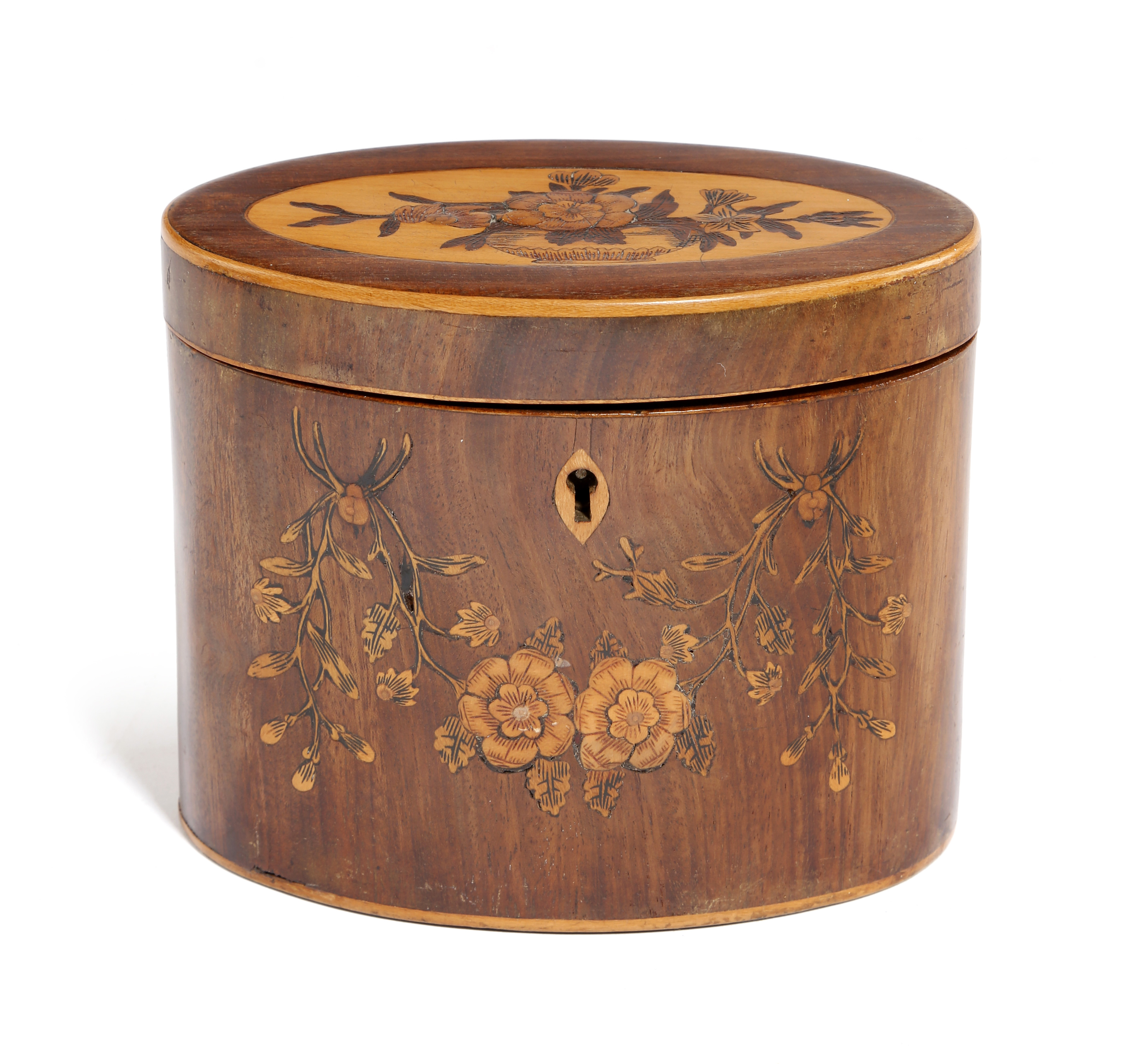 A George III mahogany and marquetry oval tea caddy, inlaid with panels of urns and flowers, the hinged lid revealing a lidded interior, 11.9cm high, 14.2cm wide.
