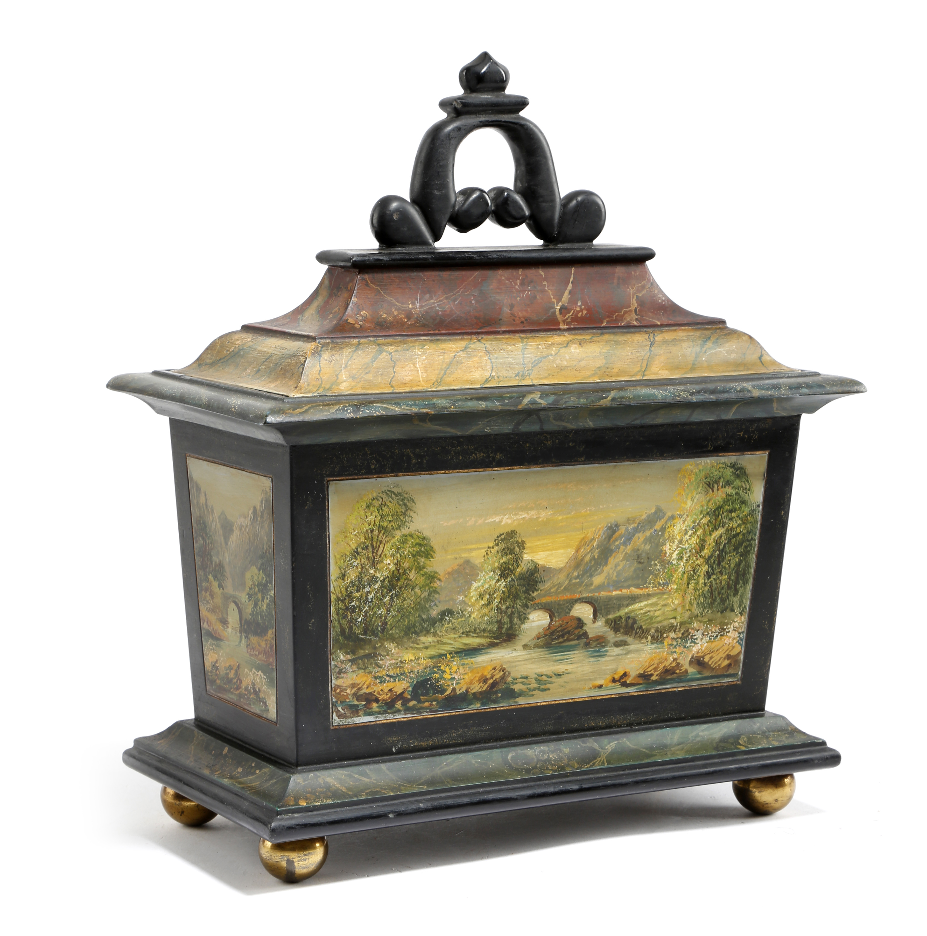 A Victorian Welsh painted slate tea caddy, or tobacco box, with marbled decoration, the body painted with lakeland scenes, the lid with a scroll handle revealing an interior with twin divisions, on brass ball feet, 30cm high, 25.5cm wide, 13.6cm deep.