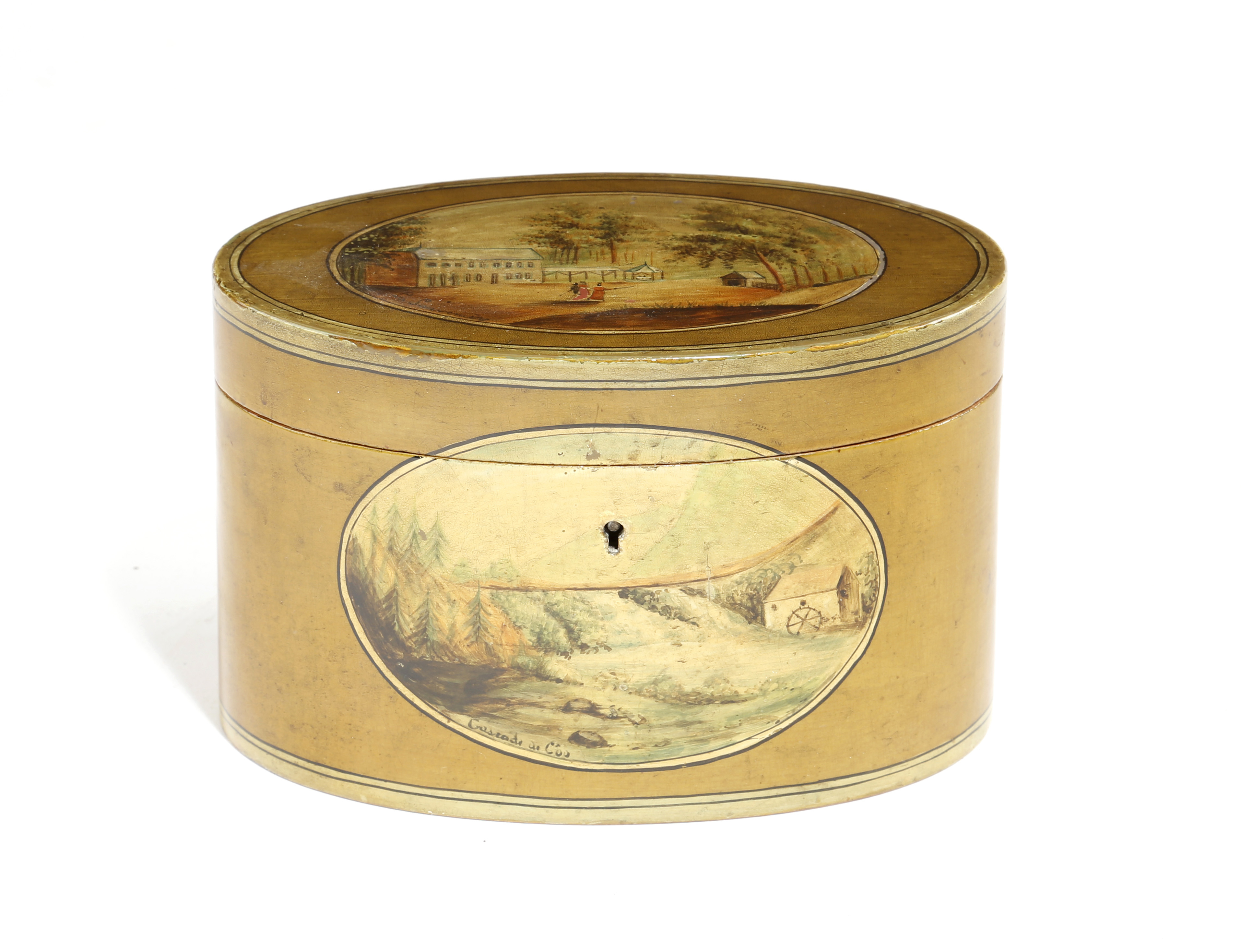 A rare early 19th century Belgian Spa oval painted tea caddy, the hinged lid, front and back decorated with landscape scenes titled 'La Sauveniere', 'Cascade de Coq' and 'Justerville', with a vacant interior, 10.5cm high, 16.3cm wide.