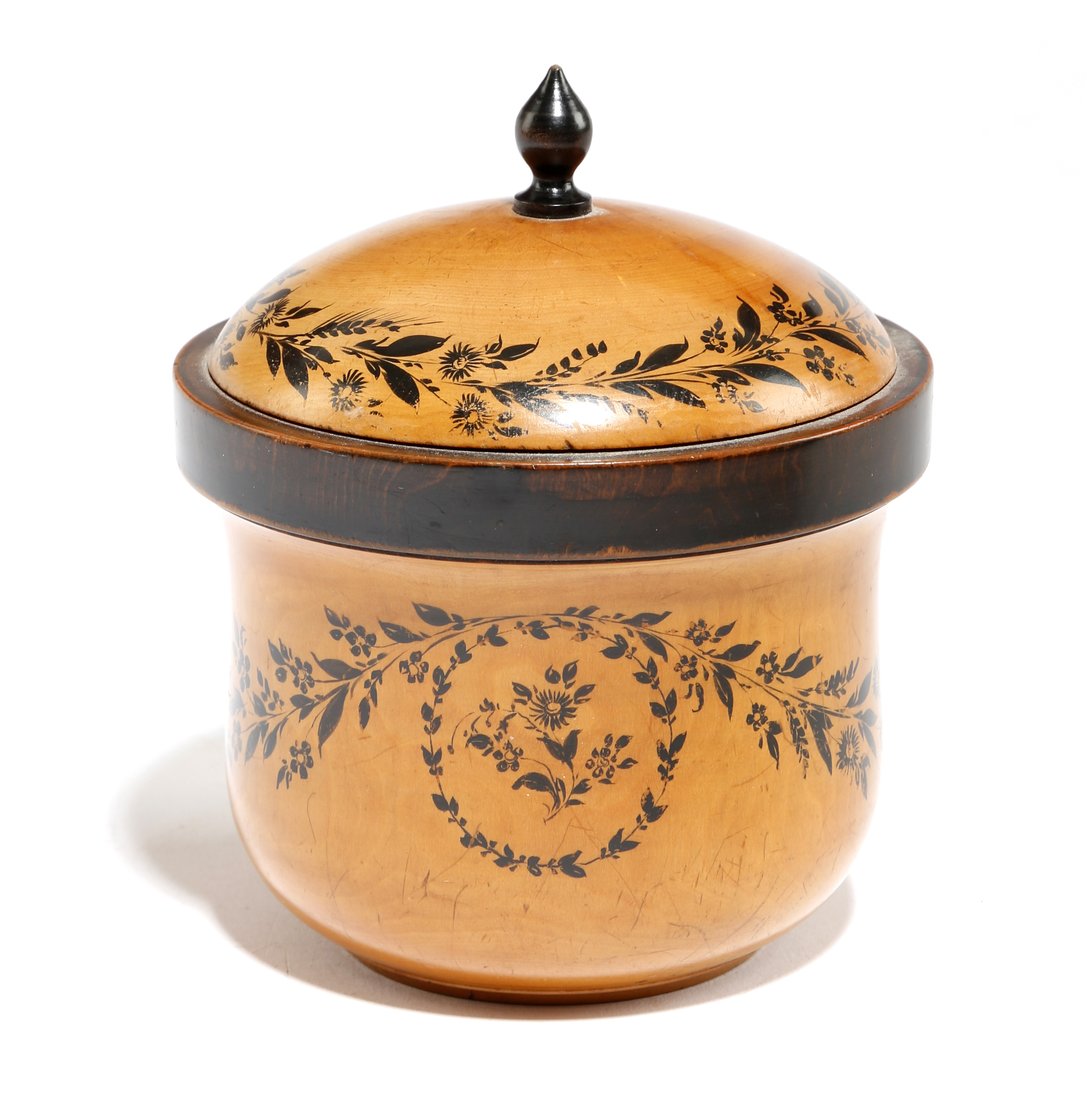 An early 19th century satinwood and ebonised single tea caddy, the lift-off lid with a turned finial and painted with bands of leaves and flowers, 12cm high, 10.4cm diameter.