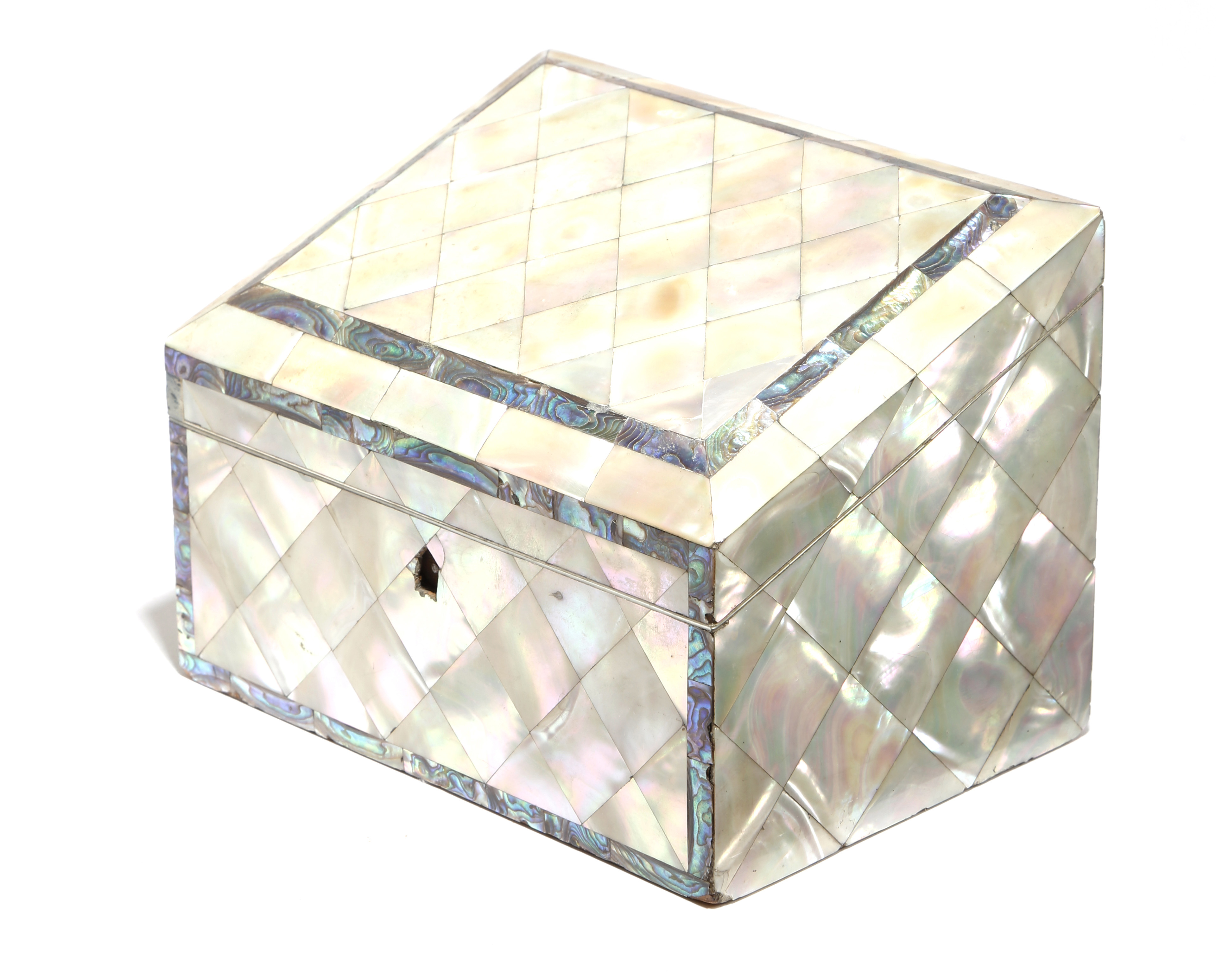 λ A Victorian mother of pearl stationery box, with abalone banding, the sloping hinged lid revealing three letter divisions and with ivory edging, 13.4cm high, 17.8cm wide, 13cm deep.