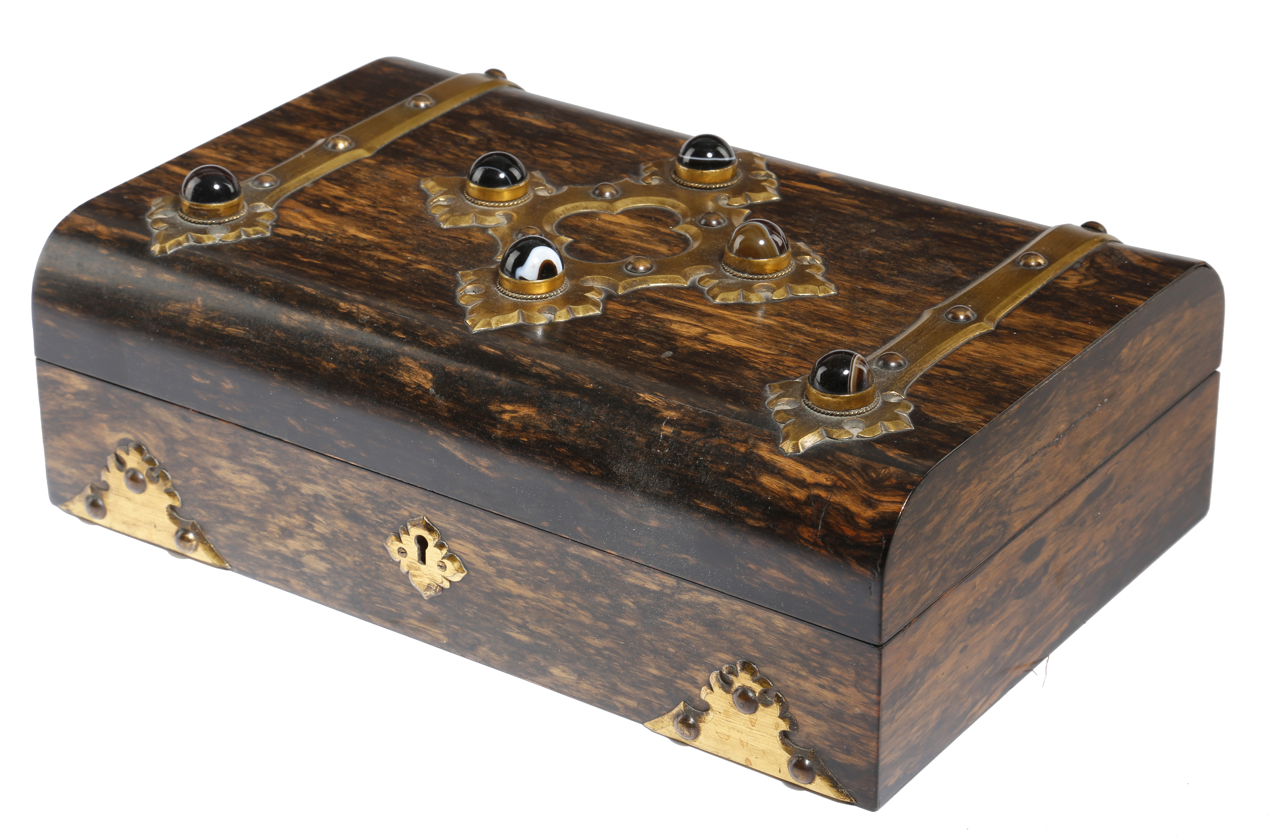 λ A Victorian macassar ebony games compendium by John Bagshaw & Sons, decorated with brass strapwork and agate cabochons, the leather and silk lined interior with divisions containing playing cards, counters and ebony and ivory markers, the underside of the lid inset with ivory cribbage boards, with a brass plaque stamped 'JOHN BAGSHAW & SONS LIVERPOOL', 10.8cm high, 29.6cm wide, 19.5cm deep.