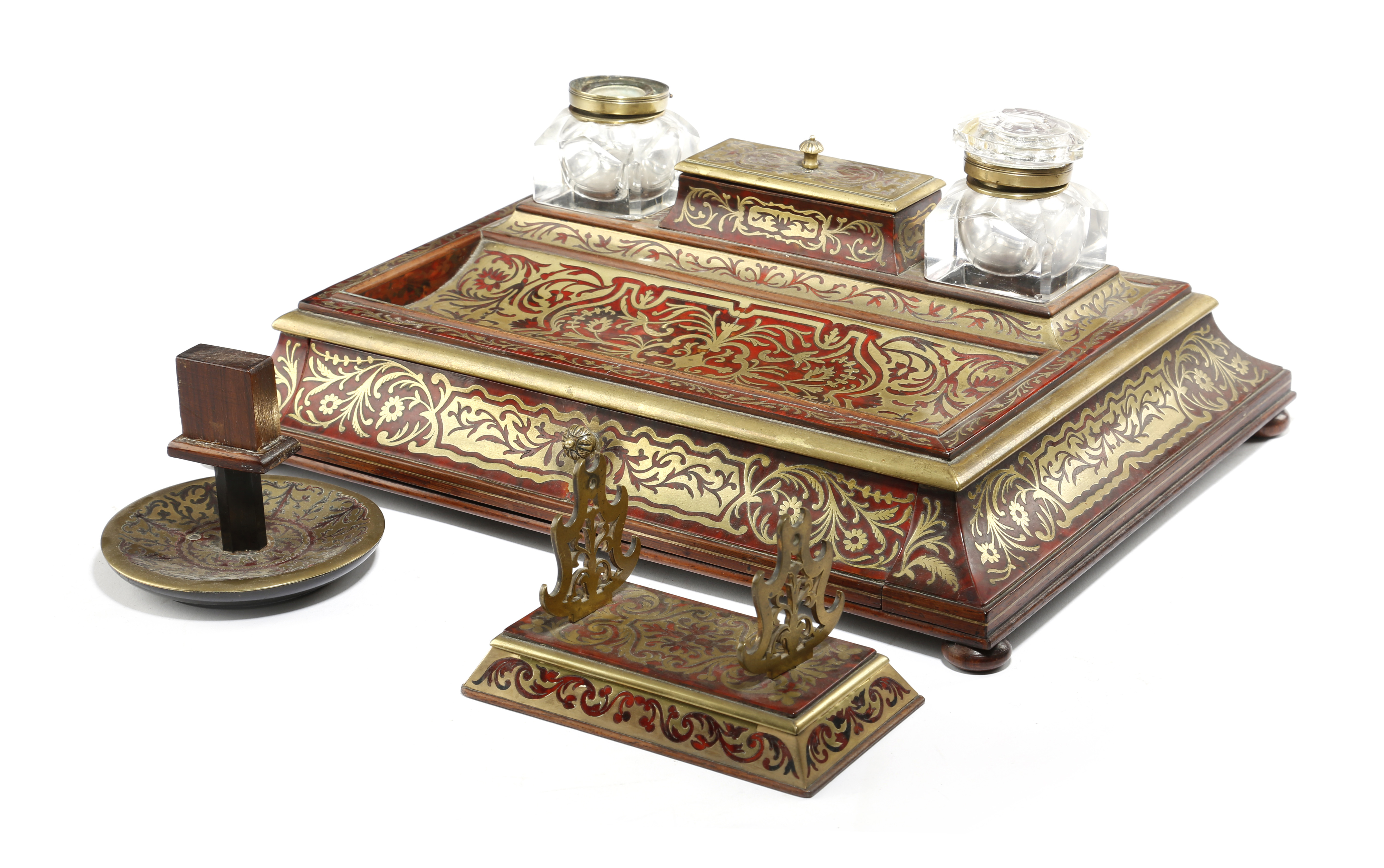 λ A Victorian boulle inkstand in the manner of Asprey, with foliate designs of cut-brass on a tortoiseshell ground, with a pair of cut-glass inkwells, (one lid missing), flanking a lidded box, above a dipped pen tray and a mahogany lined base drawer, on flattened bun feet, 37.3cm high, together with a similar pen holder and a matchbox holder. (3)