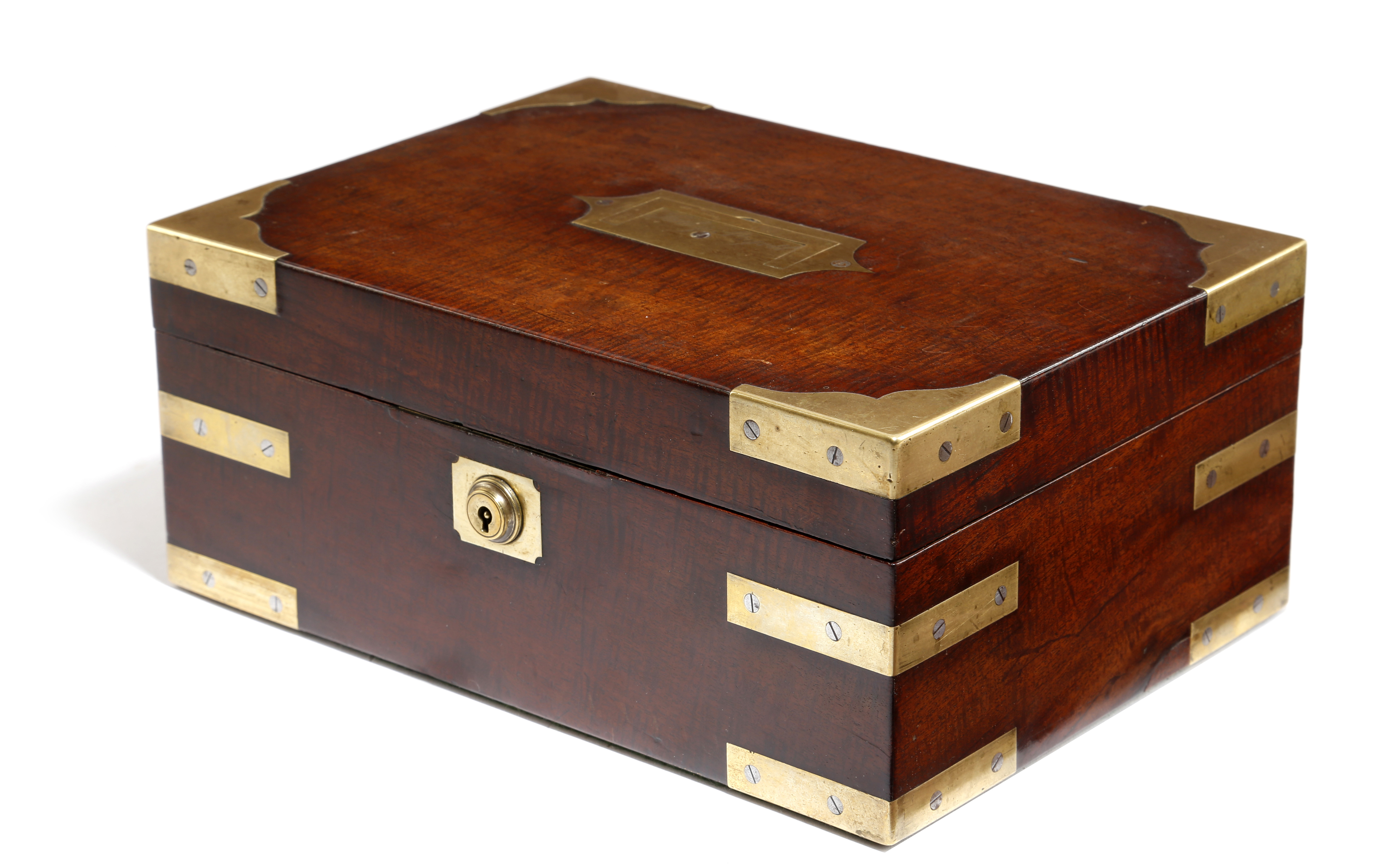 An early 19th century fiddleback mahogany and brass bound jewellery box