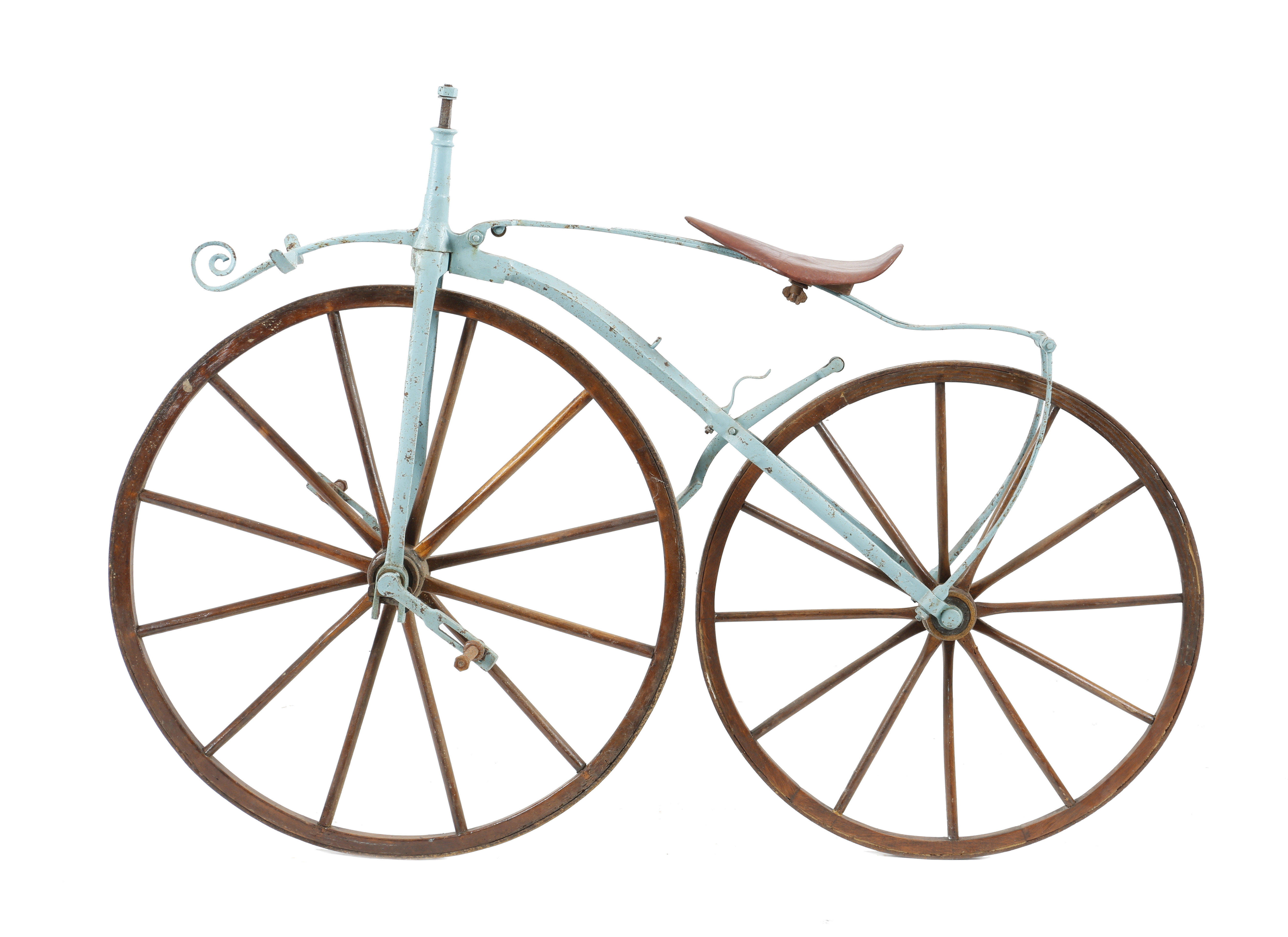 A 19th century wrought iron velocipede or boneshaker, with a leather saddle and with wood spokes, 102.3cm high, 144cm long.