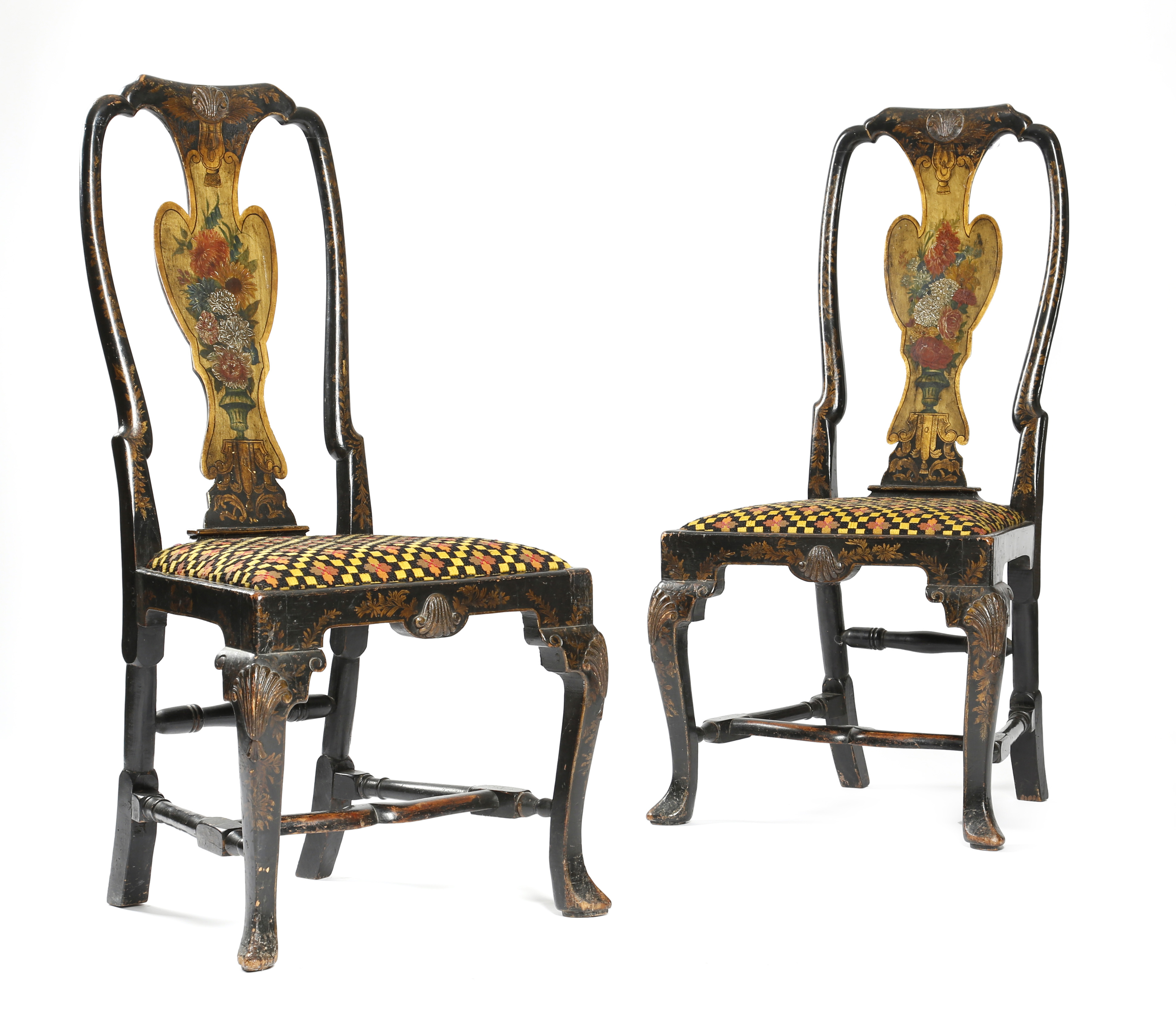 A pair of ebonised and painted side chairs in Queen Anne style, each with gilt leaf decoration, the vase shaped splat decorated with an urn of flowers, above a drop-in seat, on shell capped cabriole feet. (2)