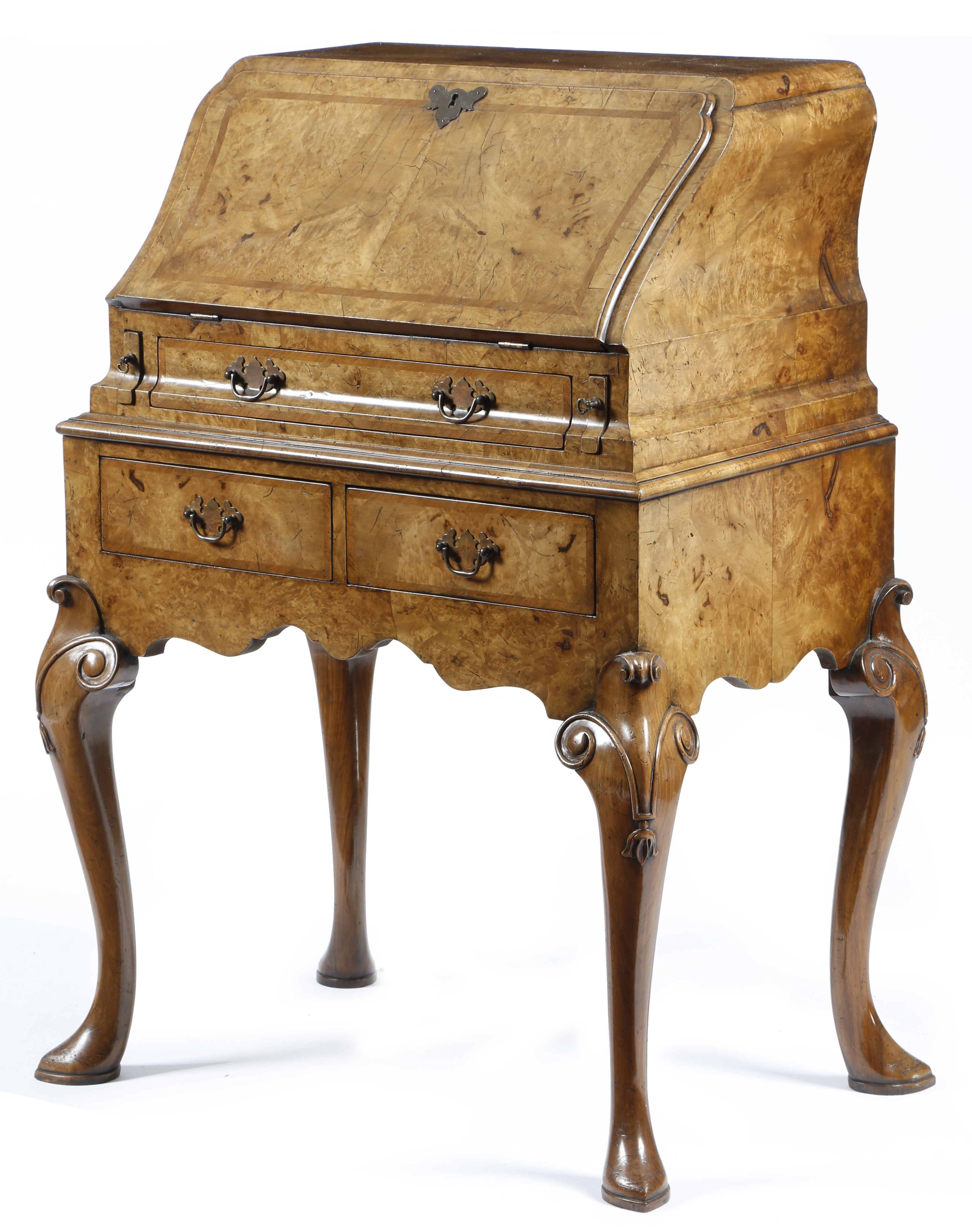 A walnut bureau on stand in Queen Anne style, the crossbanded fall revealing pigeonholes, drawers and a central cupboard, above a long drawer, the stand fitted with two frieze drawers, on scroll carved cabriole legs and pad feet, early 20th century, 93.7cm high, 70cm wide, 46.5cm deep.