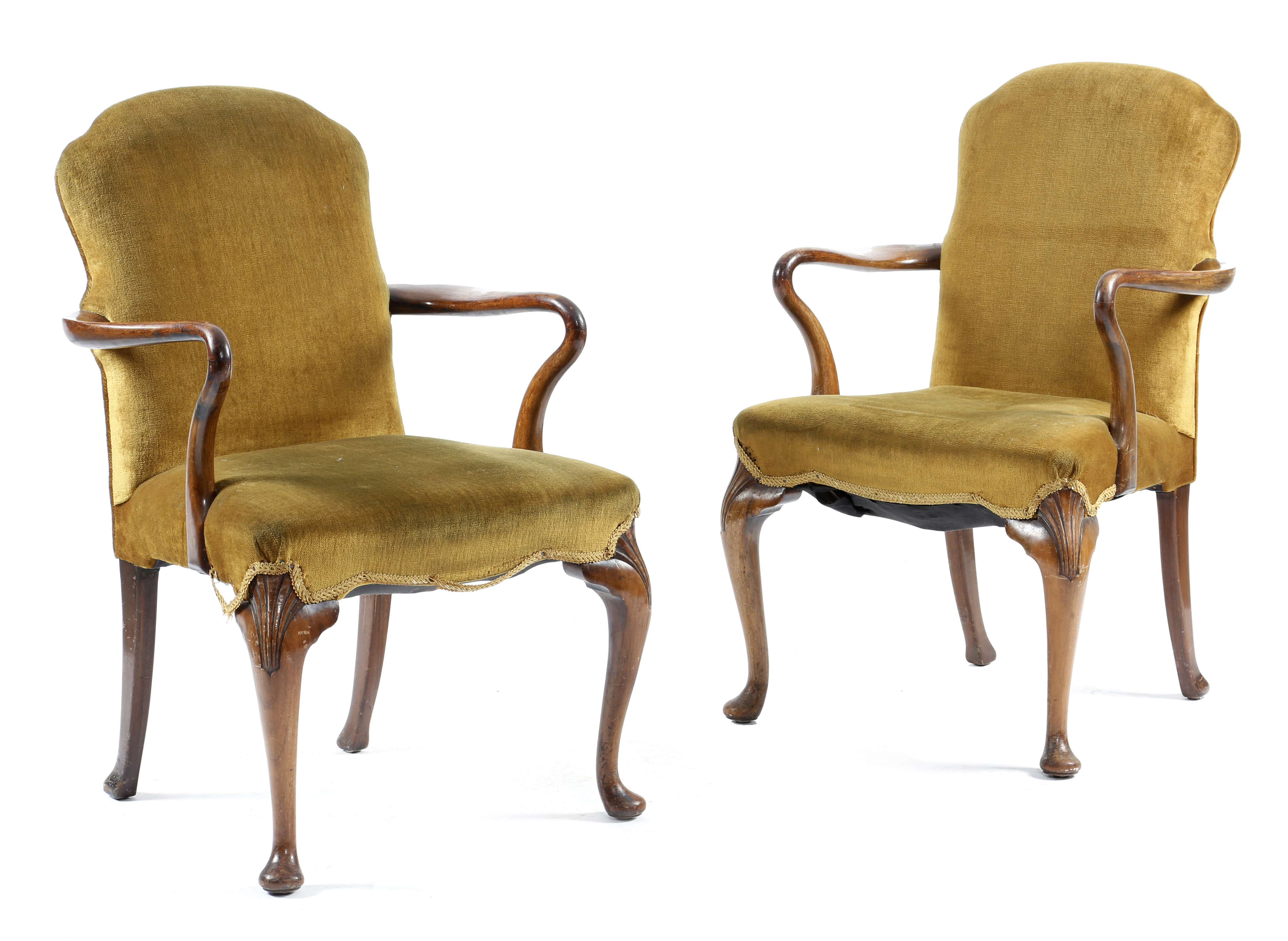 A pair of walnut elbow chairs in George II style, each with an arched padded back and seat with shepherd's crook arms, on cabriole front legs and pad feet, late 19th / early 20th century. (2)