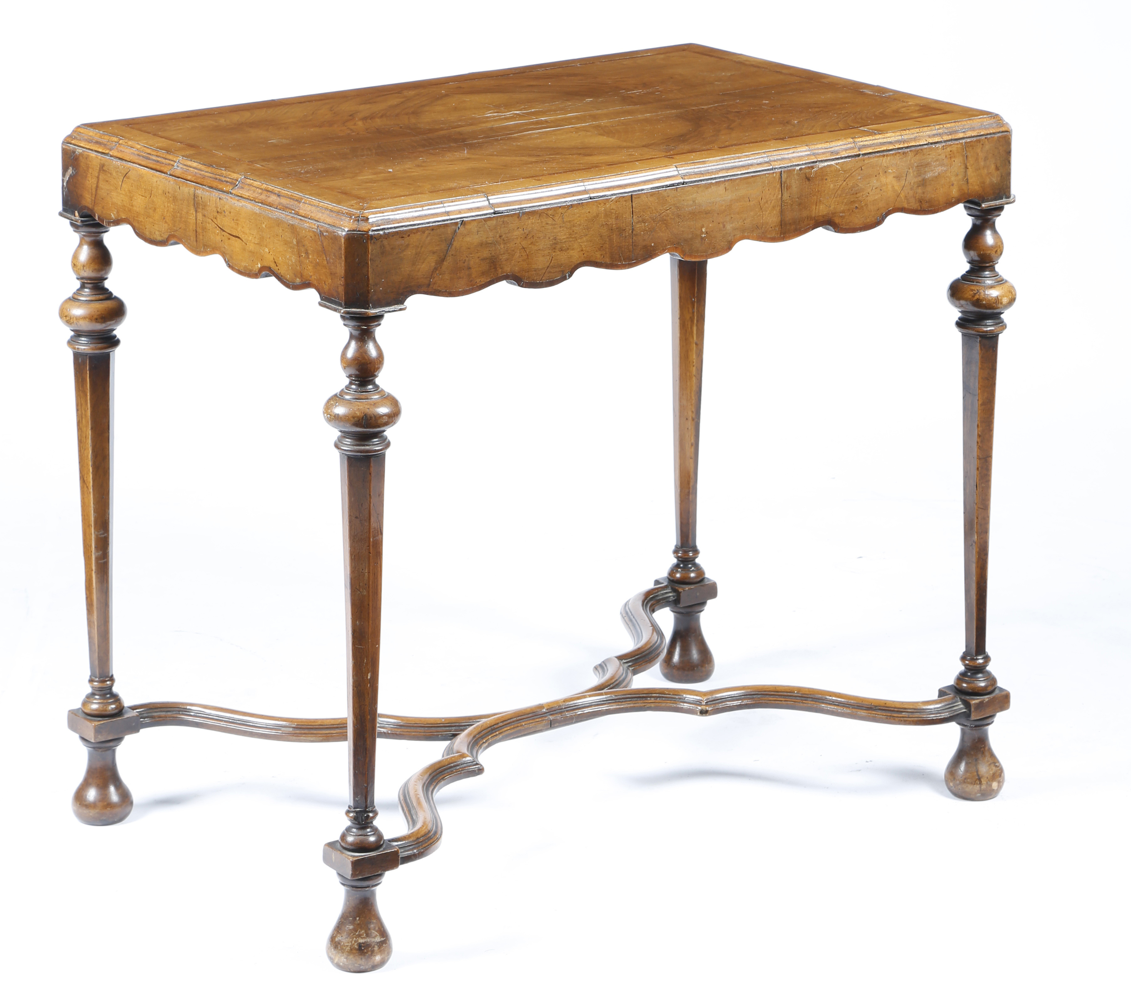 A walnut centre table in William and Mary style, the quarter veneered crossbanded top above faceted legs united by a shaped stretcher, early 20th century, 69.4cm high, 77.5cm wide, 52.8cm deep.