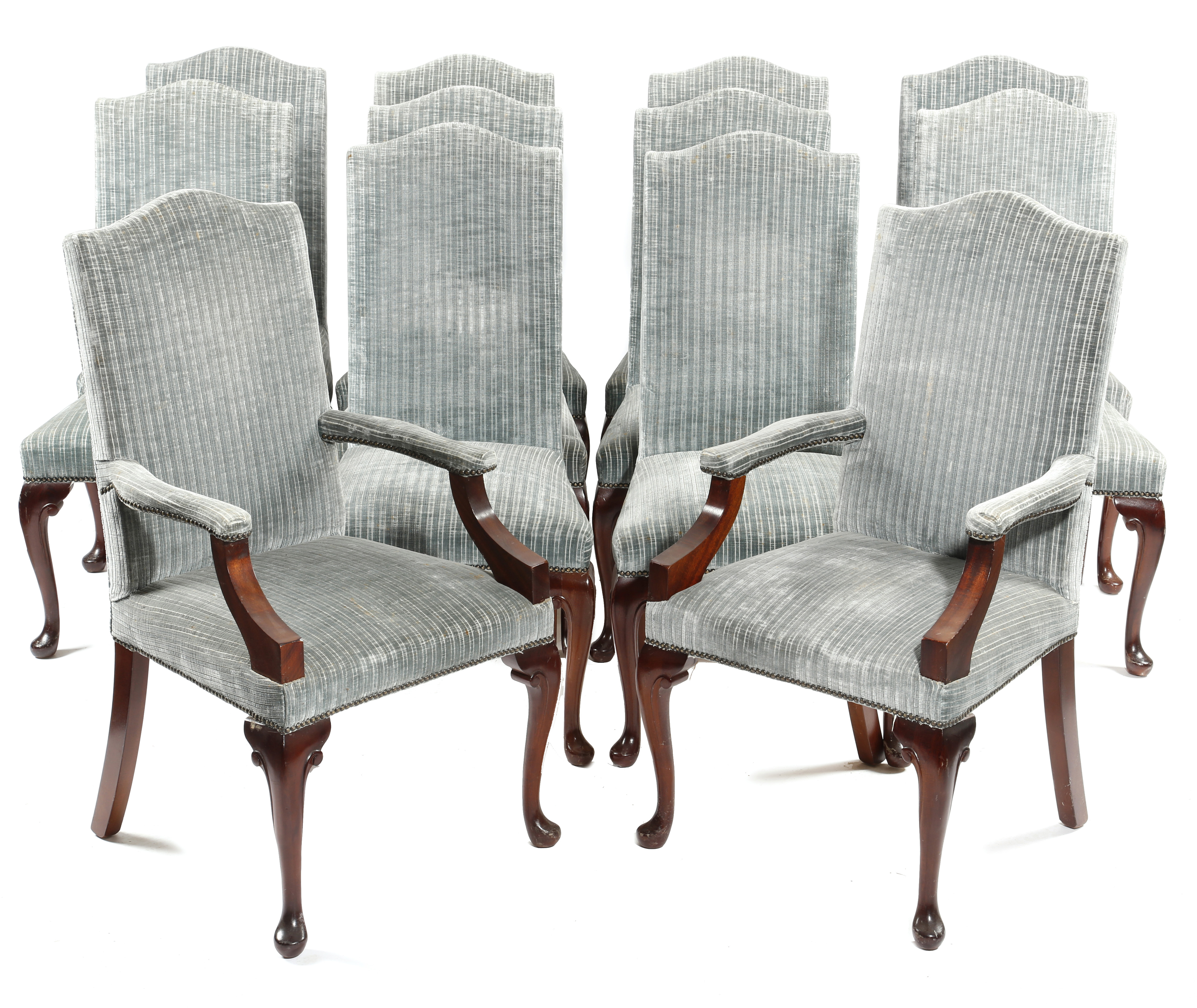 A set of twelve mahogany dining chairs in George I style, each with an arched padded back and seat, on cabriole front legs and pad feet, 20th century, comprising: a pair of open armchairs and ten side chairs. (12)