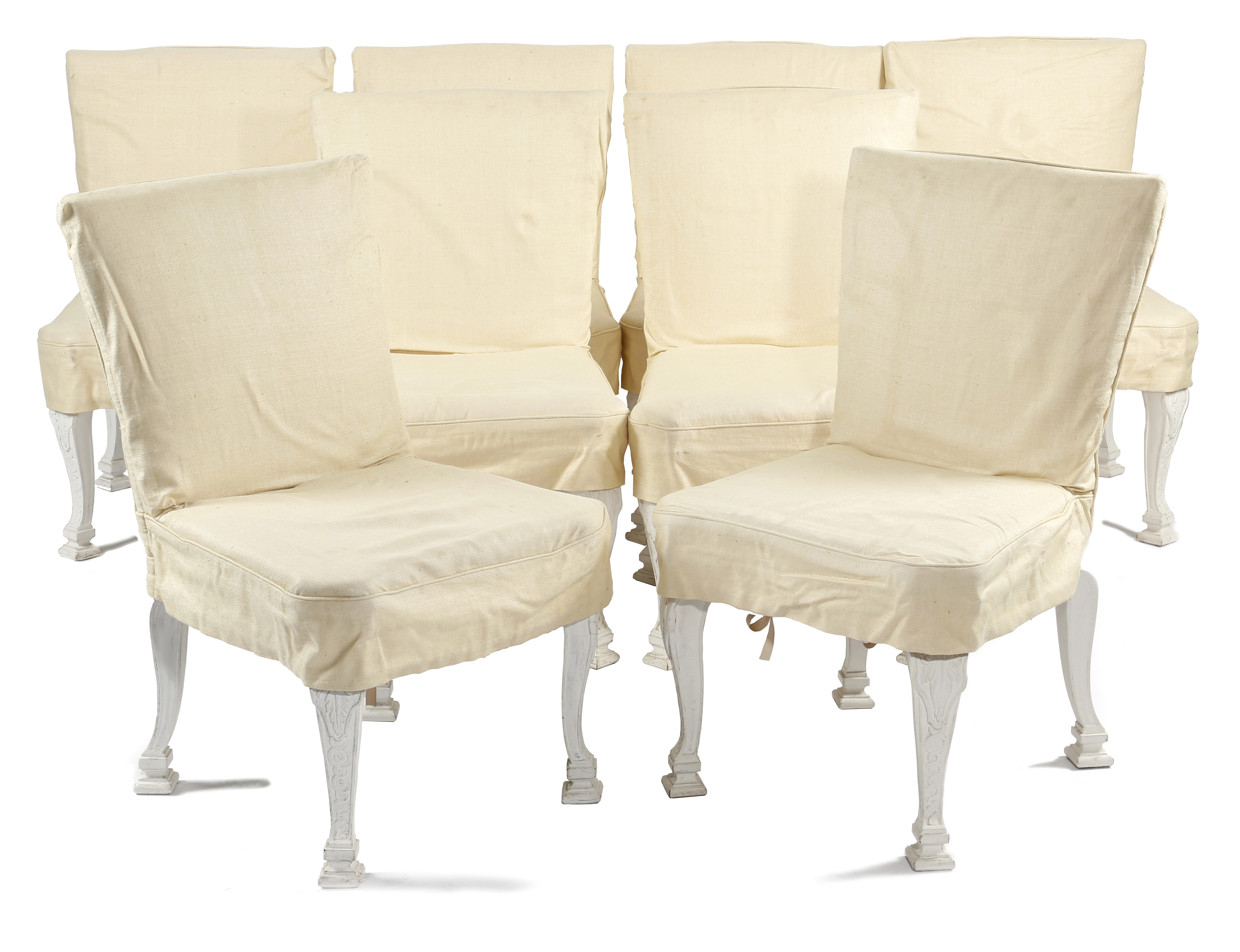 A set of eight painted side chairs in George II style after a design by William Kent, each with a padded back and seat, above a fluted frieze and guilloche carved square section cabriole legs and block feet, with loose covers, two early 20th century and six later copies. (8)