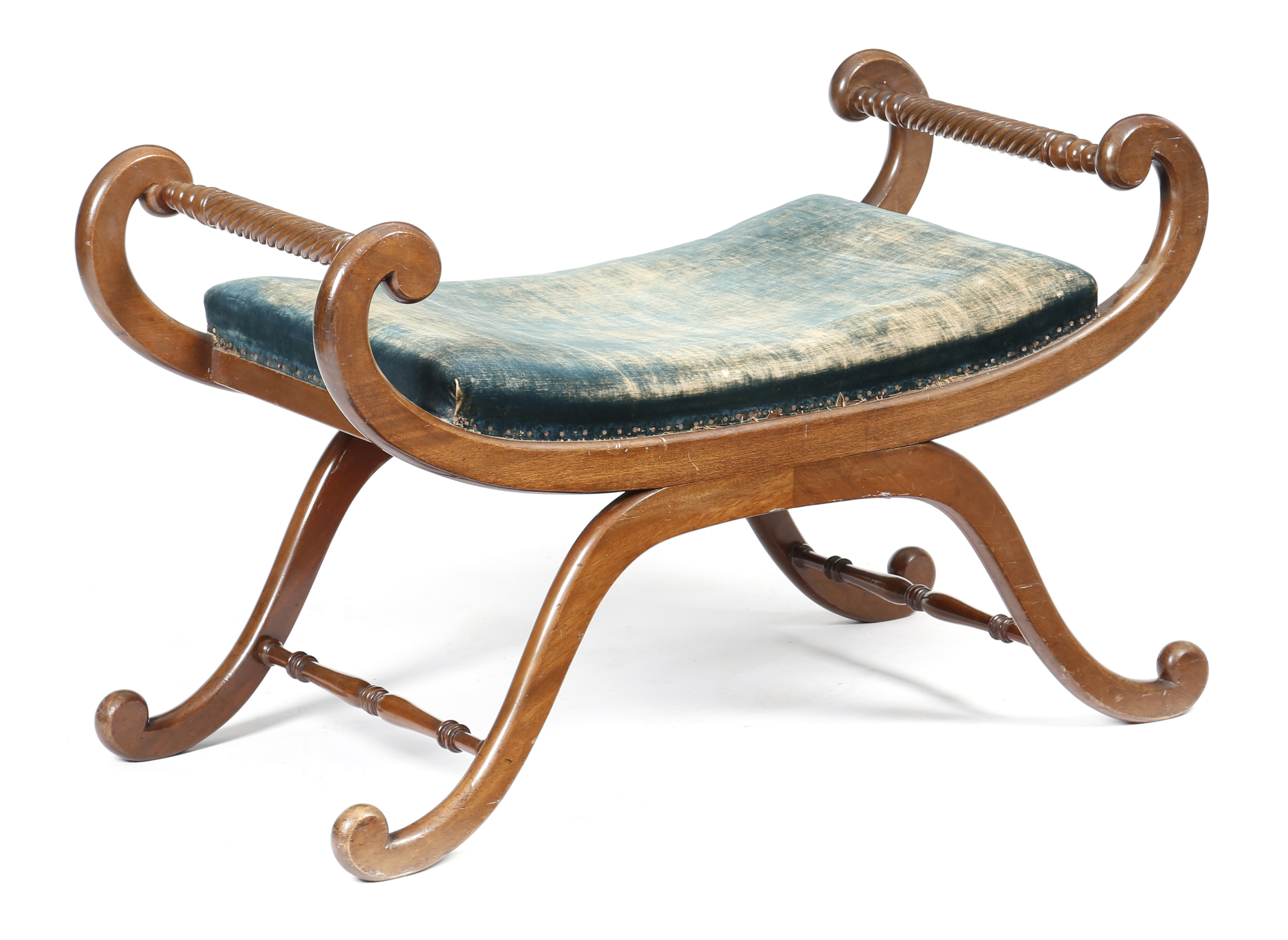 A mahogany window seat in Regency style, the scroll and 'X' shape frame with an upholstered seat and spiral twist lifts, 56cm high, 92.5cm wide, 46cm deep.