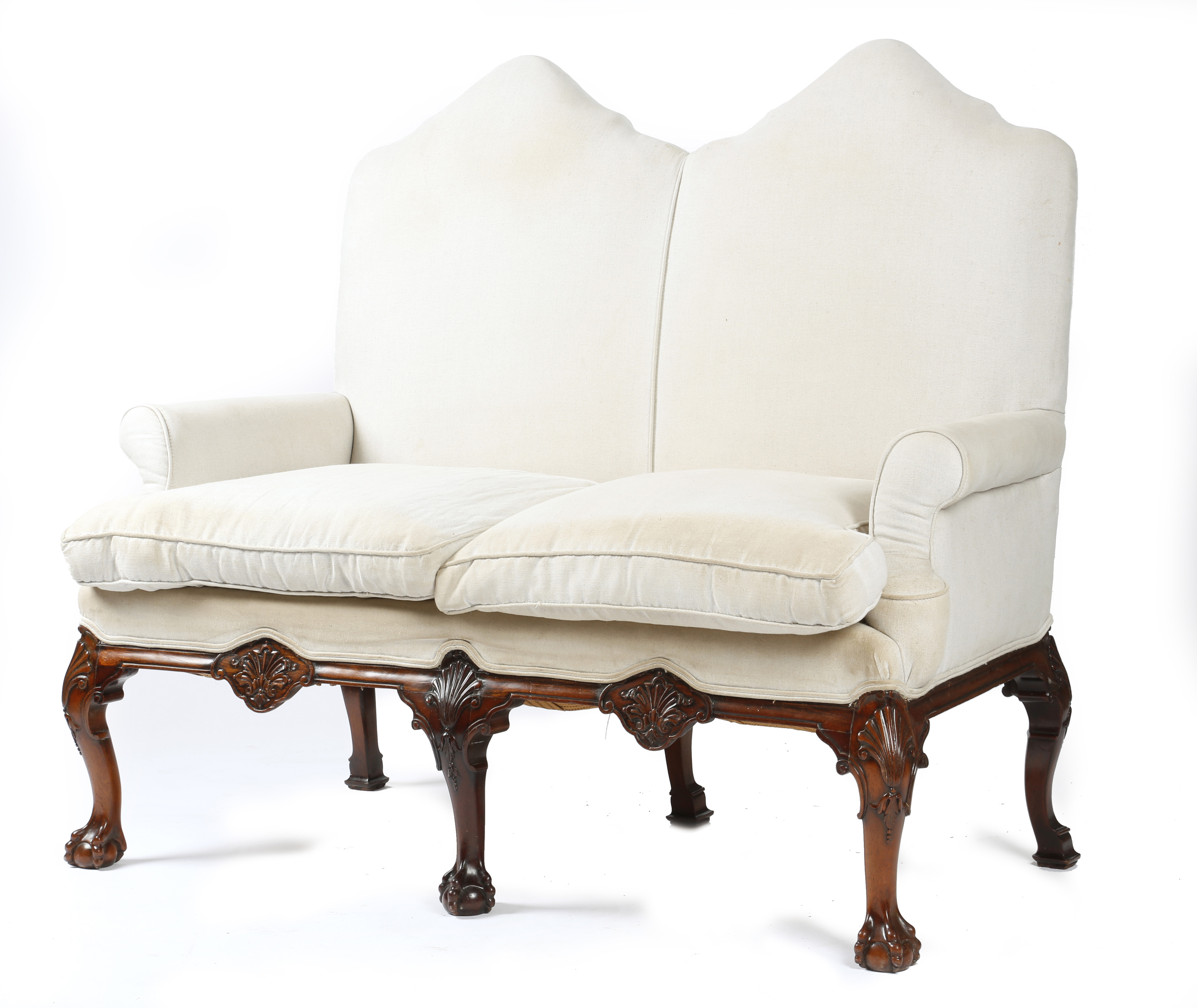 A mahogany two seater settee in George II style, the undulating padded back above scroll arms, on shell capped cabriole legs and claw and ball front feet, late 19th / early 20th century, 122.9cm high, 149.5cm wide, 73cm deep.