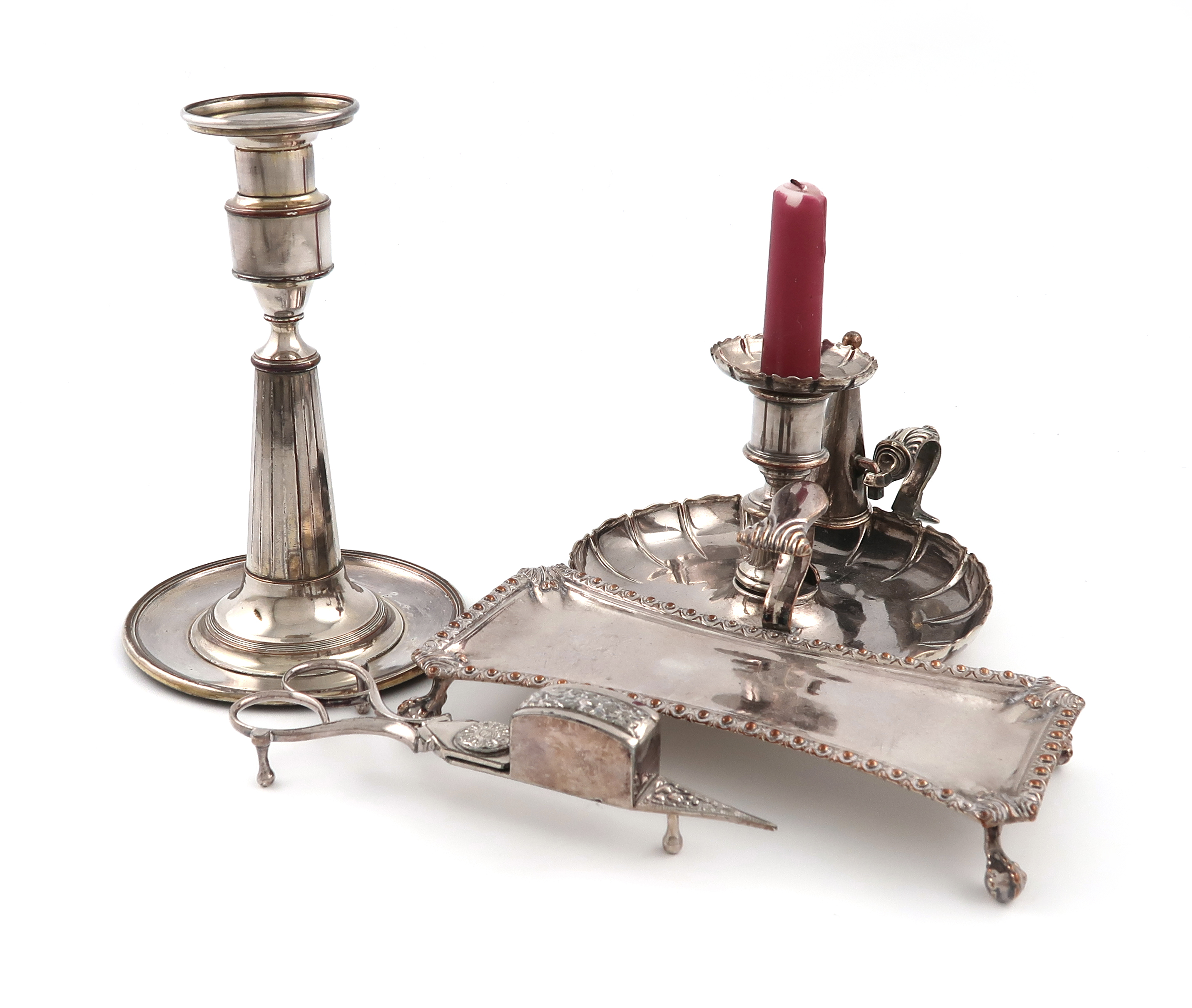 comprising: a chamber stick, of lobed circular form, by the Mappin Brothers, a single candlestick of tapering circular form, a snuffer's stand of shaped rectangular form, beaded border, plus a pair of scissor snuffers. (4)