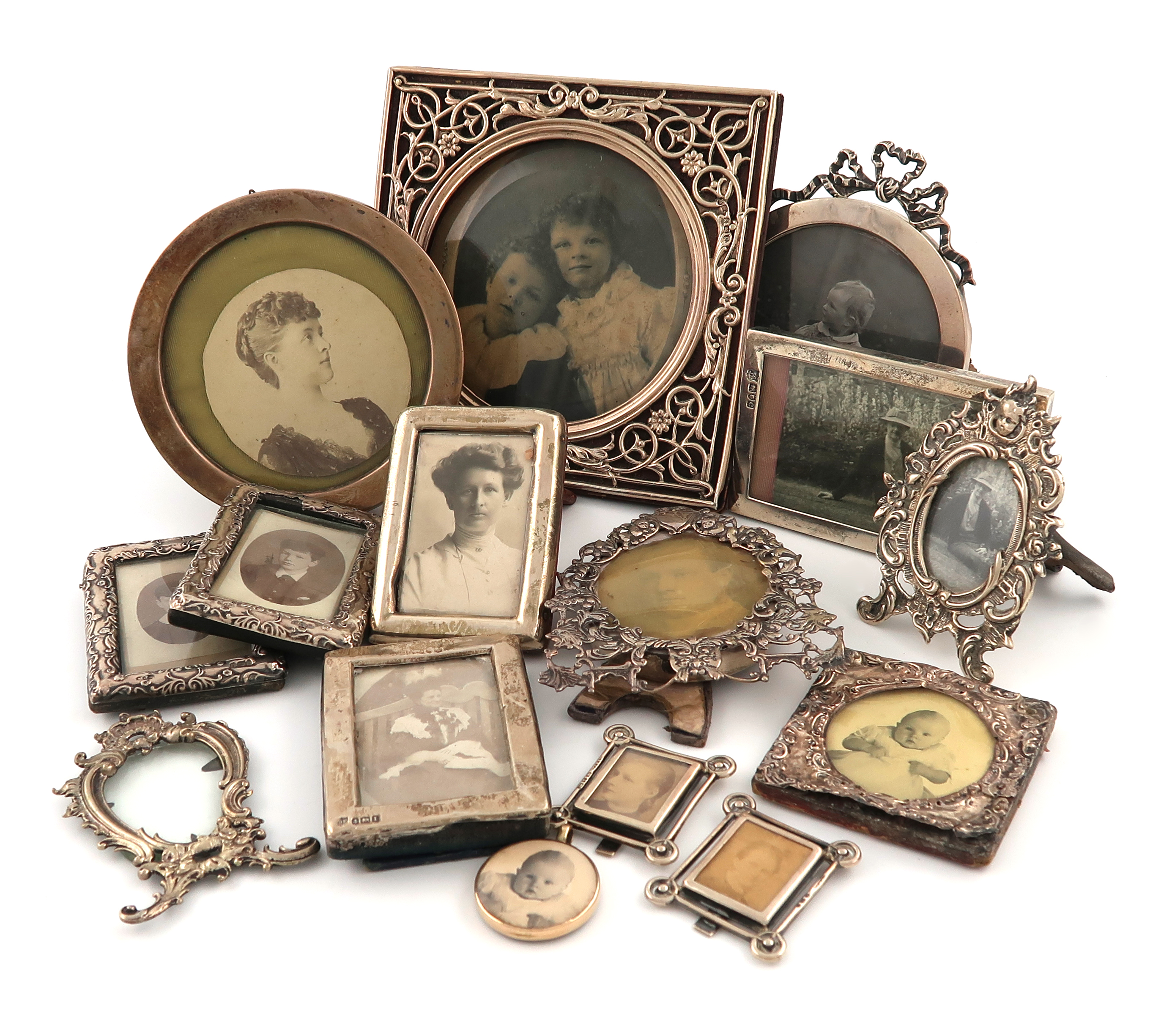 comprising: an Edwardian one of square form, by H. Matthews, Birmingham 1902, pierced overlay scroll work on a velvet background, plus a pair of miniature frames by Saunders and Shepherd, Birmingham 1899 and 1900, two circular frames, a shaped pierced arched one, by William Comyns, London 1887, another similar, London 1898, a continental frame, plus five of rectangular form, one square and an unmarked gold locket frame of circular form. (15)