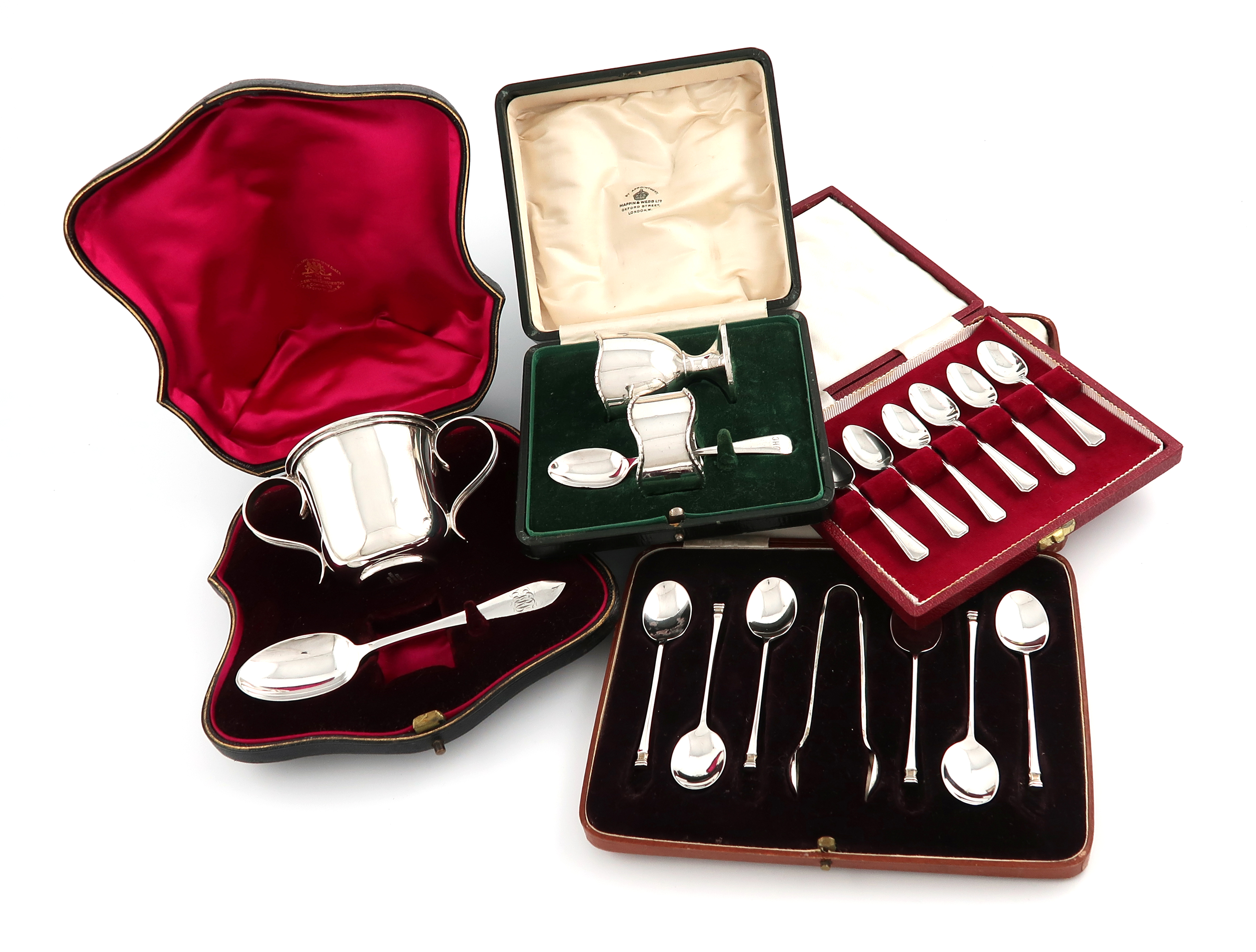 comprising: a cased two-handled cup and spoon, by The Goldsmiths and Silversmiths Company, London 1901, a cased set of six coffee spoons, a cased egg cup, napkin ring and spoon, and six coffee spoons and tongs in a later case, approx. weight 10oz. (qty)