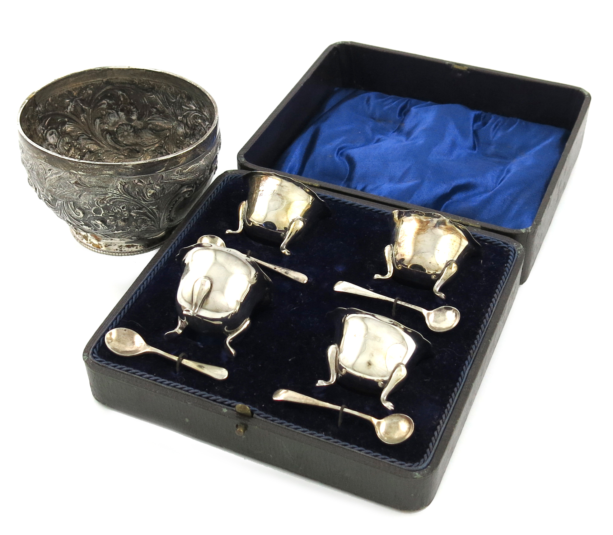 circular form, embossed foliate decoration on a matted background, plus a cased set of four silver salt cellars with four various spoons, circular form, blue glass liners, approx. weight 7oz. (2)