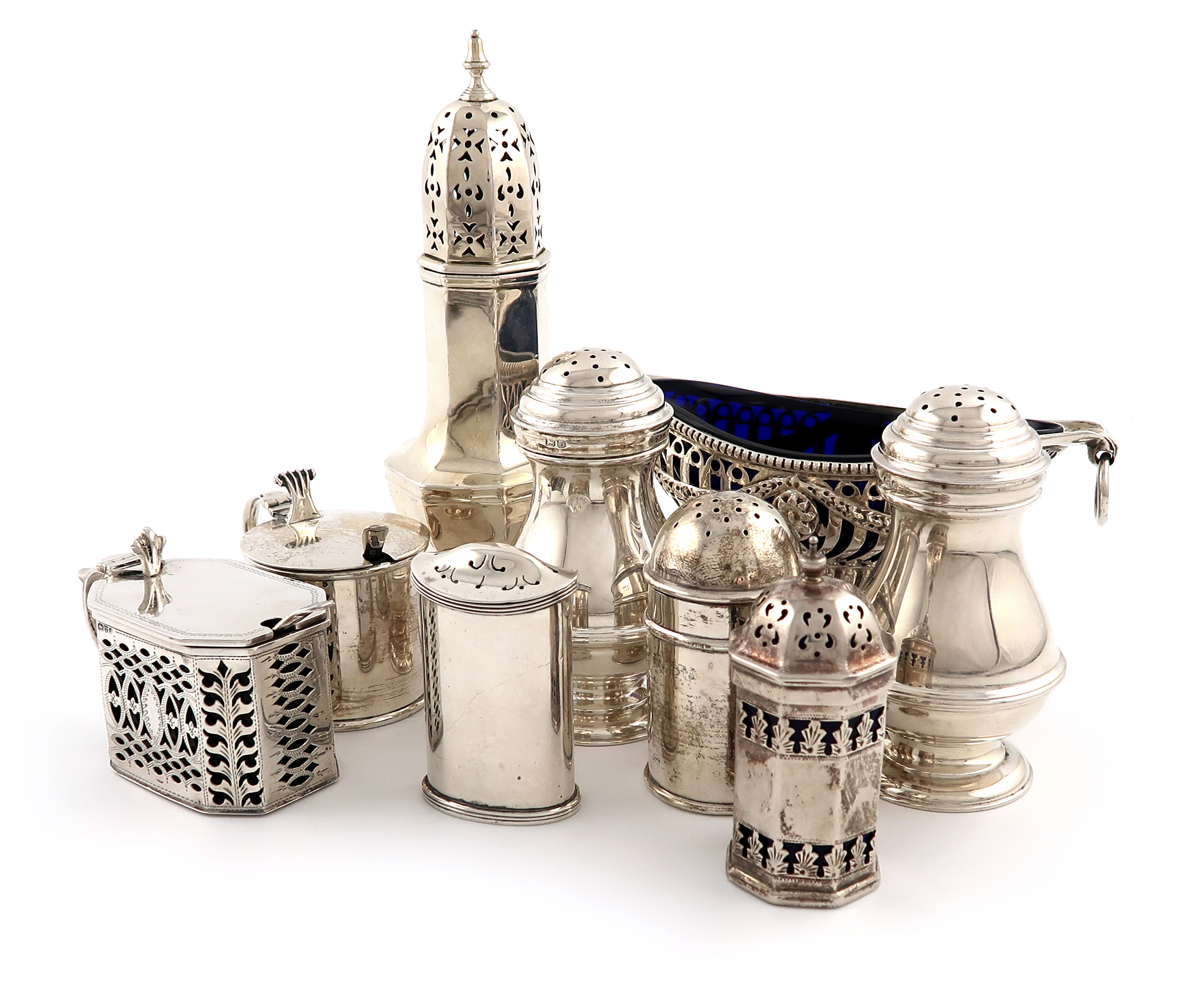 comprising: a large salt cellar in the George III manner, by Nathan and Hayes, Chester 1901, oval boat form, drop ring handles, blue glass liner, plus a pair of bun pepper pots, a sugar caster, two mustard pots with spoons, and three pepper pots, approx. weight 20oz. (qty)