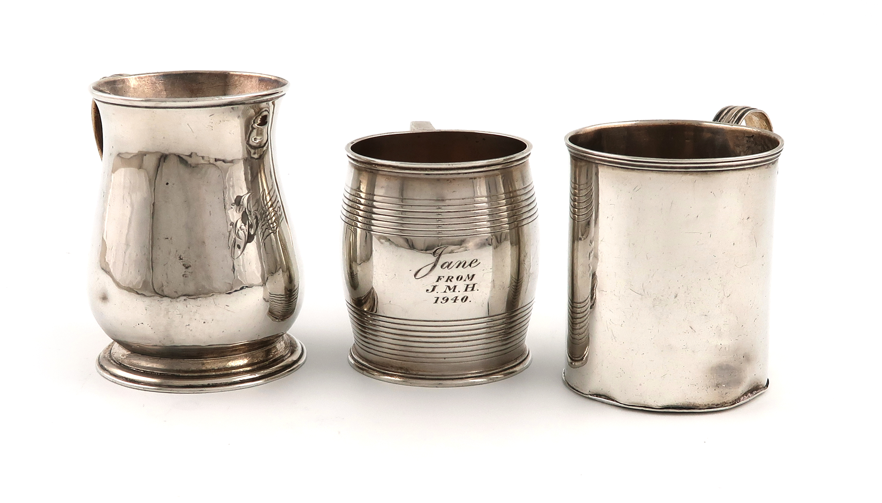 baluster form, leaf capped scroll handle, initialled, height 8cm, plus a George III silver mug, London 1804 and another silver mug, approx. total weight 9oz. (3)