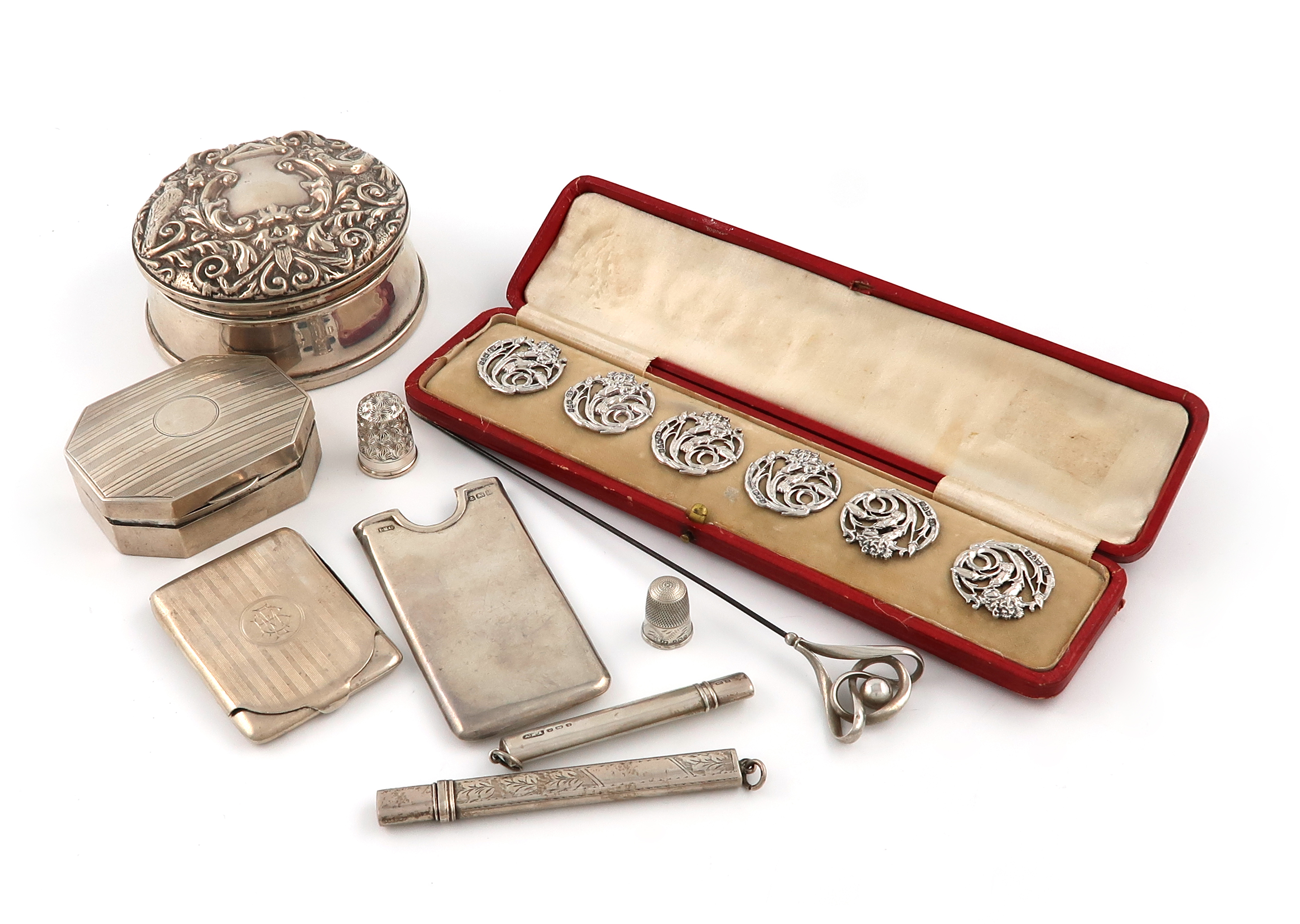 comprising: a set of six Edwardian buttons, by Robert Pringle, Chester 1901, in a fitted case, plus a Charles Horner hat pin, a circular dressing table box, with embossed decoration, another box with engine-turned decoration, two thimbles, a matchbox cover, a card case, two pencils, approx. weighable 3.5oz. (qty)